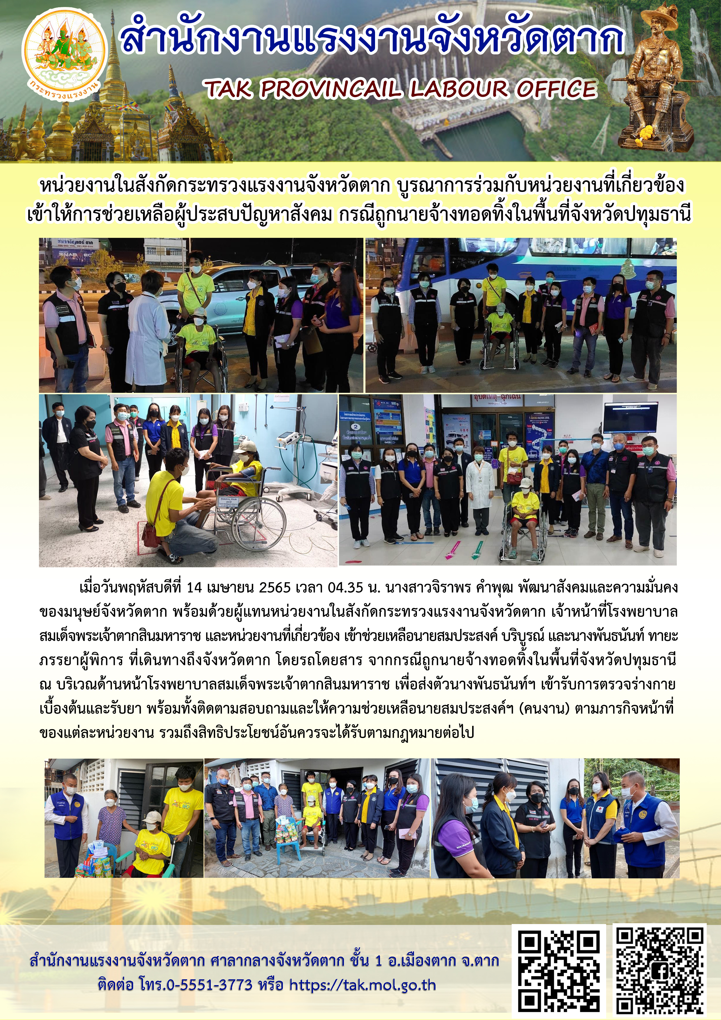 หน่วยงานในสังกัดกระทรวงแรงงานจังหวัดตาก บูรณาการร่วมกับหน่วยงานที่เกี่ยวข้อง เข้าให้การช่วยเหลือผู้ประสบปัญหาสังคม กรณีถูกนายจ้างทอดทิ้งในพื้นที่จังหวัดปทุมธานี