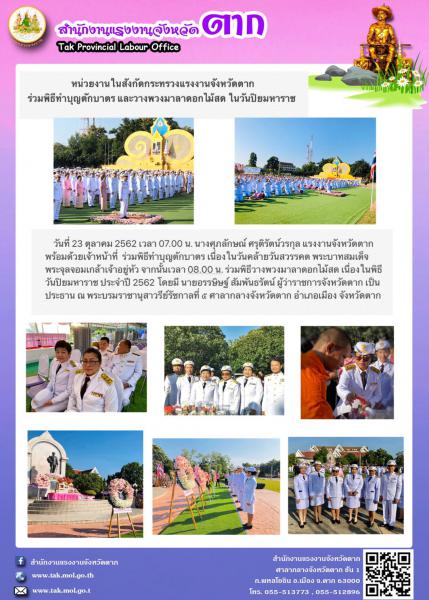 หน่วยงานในสังกัดกระทรวงแรงงานจังหวัดตาก ร่วมพิธีทำบุญตักบาตร และวางพวงมาลาดอกไม้สด ในวันปิยมหาราช ณ พระบรมราชานุสาวรีย์รัชการที่ 5 ศาลากลางจังหวัดตาก