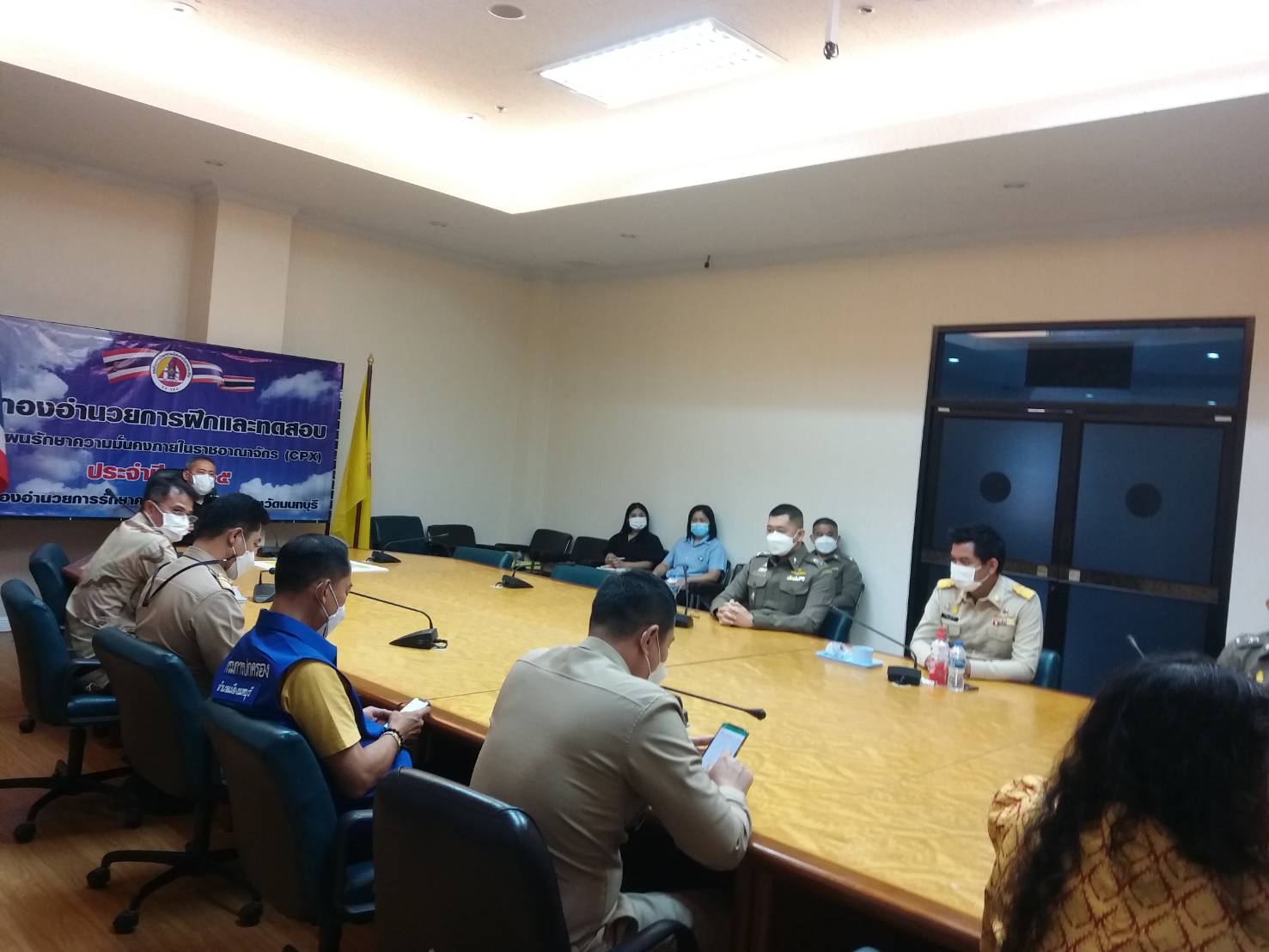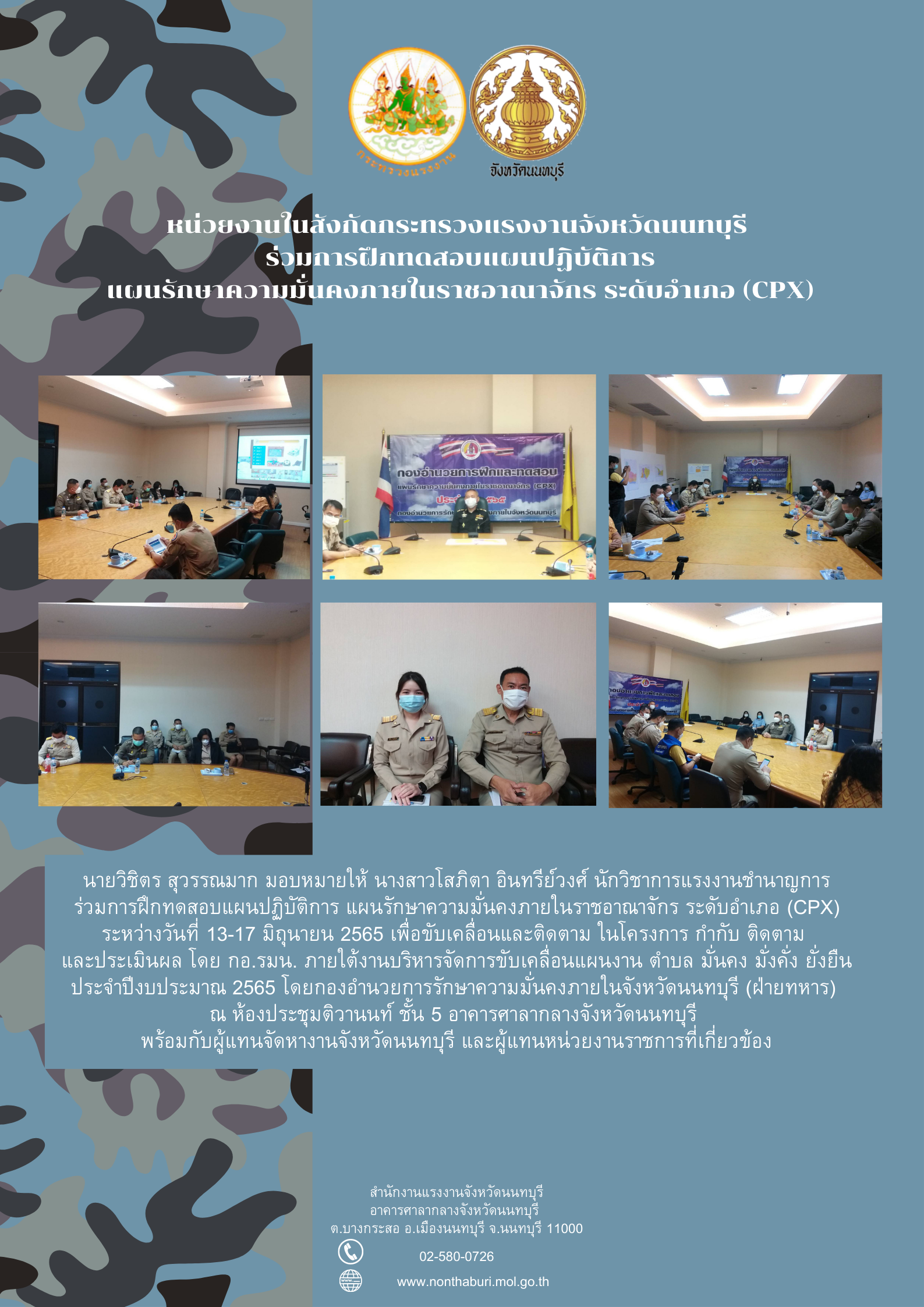 นายวิชิตร สุวรรณมาก มอบหมายให้ นางสาวโสภิตา อินทรีย์วงศ์ นักวิชาการแรงงานชำนาญการ ร่วมการฝึกทดสอบแผนปฏิบัติการ แผนรักษาความมั่นคงภายในราชอาณาจักร ระดับอำเภอ (CPX) ระหว่างวันที่ 13-17 มิถุนายน 2565 เพื่อขับเคลื่อนและติดตาม ในโครงการ กำกับ ติดตาม และประเมินผล โดย กอ.รมน. ภายใต้งานบริหารจัดการขับเคลื่อนแผนงาน ตำบล มั่นคง มั่งคั่ง ยั่งยืน ประจำปีงบประมาณ 2565 โดยกองอำนวยการรักษาความมั่นคงภายในจังหวัดนนทบุรี (ฝ่ายทหาร) ณ ห้องประชุมติวานนท์ ชั้น 5 อาคารศาลากลางจังหวัดนนทบุรี พร้อมกับผู้แทนจัดหางานจังหวัดนนทบุรี และผู้แทนหน่วยงานราชการที่เกี่ยวข้อง