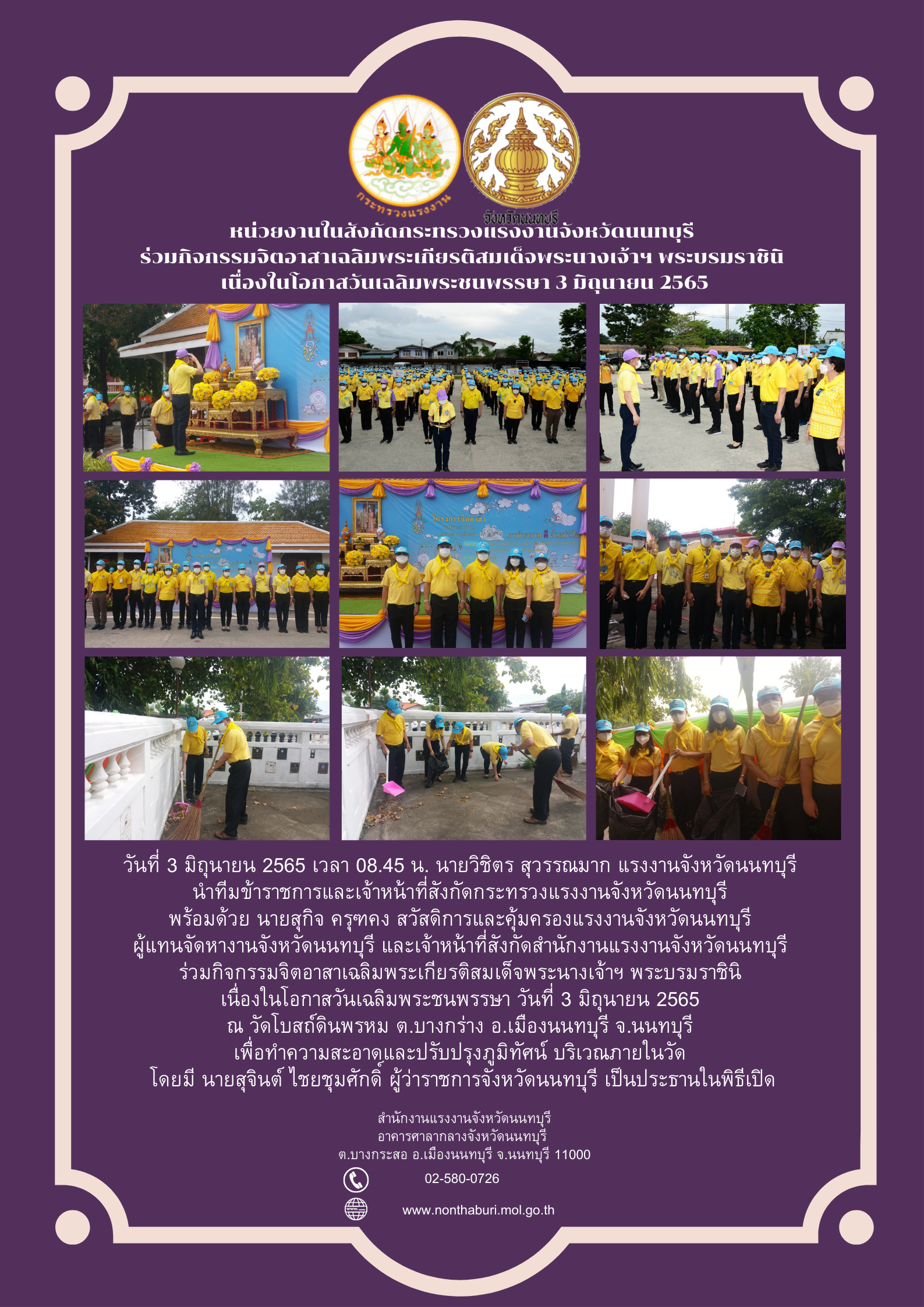 วันที่ 3 มิถุนายน 2565 เวลา 08.45 น. นายวิชิตร สุวรรณมาก แรงงานจังหวัดนนทบุรี นำทีมข้าราชการและเจ้าหน้าที่สังกัดกระทรวงแรงงานจังหวัดนนทบุรี พร้อมด้วย นายสุกิจ ครุฑคง สวัสดิการและคุ้มครองแรงงานจังหวัดนนทบุรี ผู้แทนจัดหางานจังหวัดนนทบุรี และเจ้าหน้าที่สังกัดสำนักงานแรงงานจังหวัดนนทบุรี ร่วมกิจกรรมจิตอาสาเฉลิมพระเกียรติสมเด็จพระนางเจ้าฯ พระบรมราชินิ เนื่องในโอกาสวันเฉลิมพระชนพรรษา วันที่ 3 มิถุนายน 2565 ณ วัดโบสถ์ดินพรหม ต.บางกร่าง อ.เมืองนนทบุรี จ.นนทบุรี เพื่อทำความสะอาดและปรับปรุงภูมิทัศน์ บริเวณภายในวัดโดยมี นายสุจินต์ ไชยชุมศักดิ์ ผู้ว่าราชการจังหวัดนนทบุรี เป็นประธานในพิธีเปิด