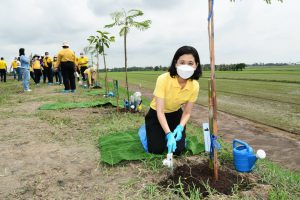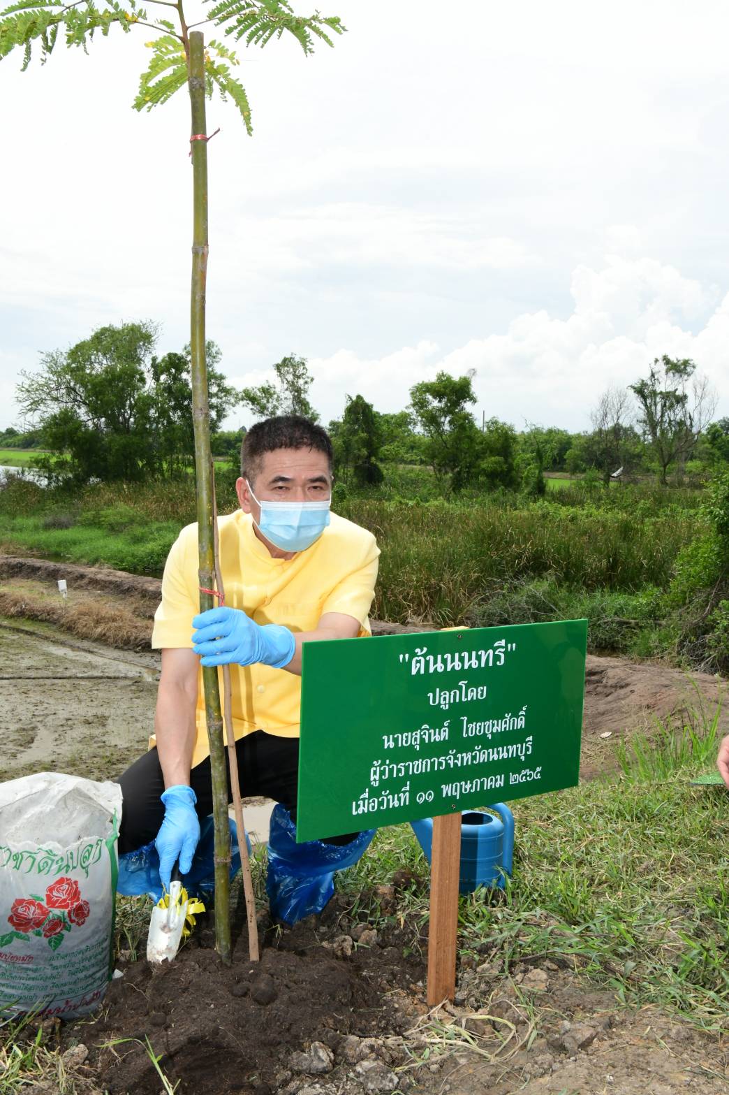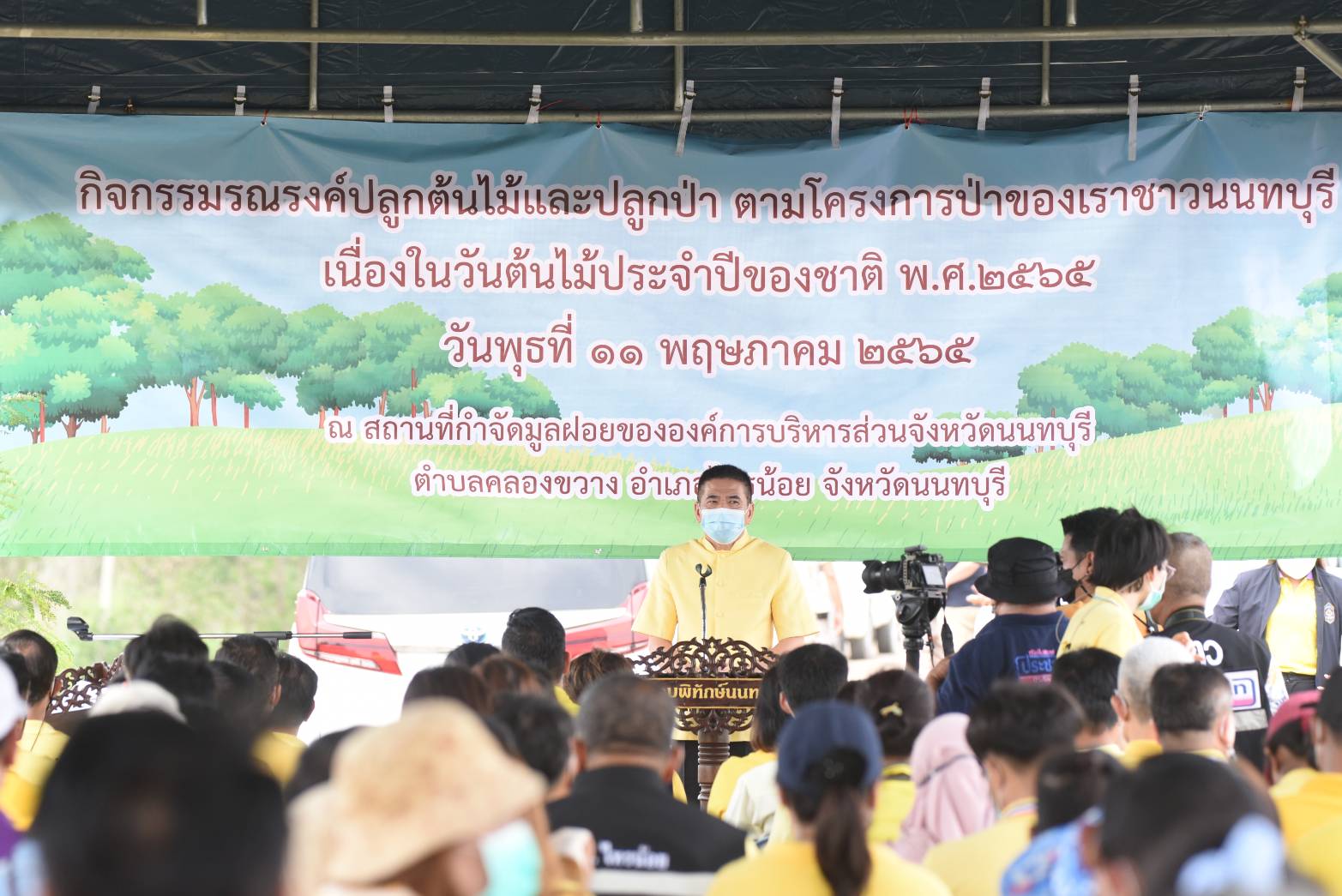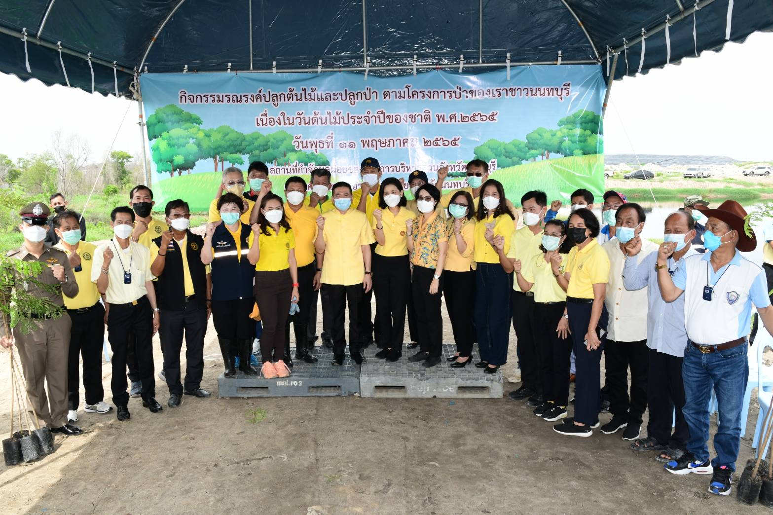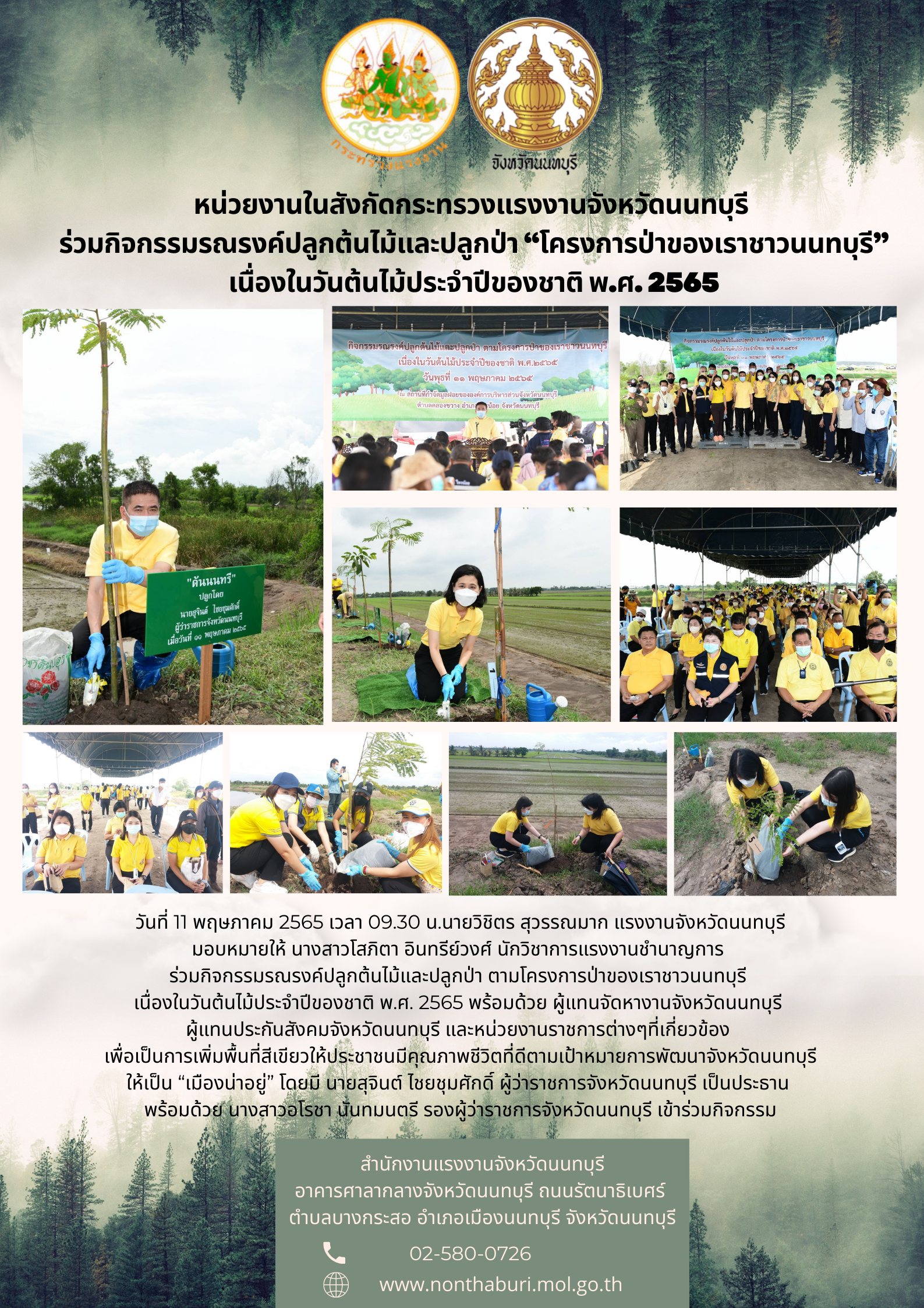 วันที่ 11 พฤษภาคม 2565 เวลา 09.30 น.นายวิชิตร สุวรรณมาก แรงงานจังหวัดนนทบุรี มอบหมายให้ นางสาวโสภิตา อินทรีย์วงศ์ นักวิชาการแรงงานชำนาญการ ร่วมกิจกรรมรณรงค์ปลูกต้นไม้และปลูกป่า ตามโครงการป่าของเราชาวนนทบุรี เนื่องในวันต้นไม้ประจำปีของชาติ พ.ศ. 2565 พร้อมด้วย ผู้แทนจัดหางานจังหวัดนนทบุรี ผู้แทนประกันสังคมจังหวัดนนทบุรี และหน่วยงานราชการต่างๆที่เกี่ยวข้อง เพื่อเป็นการเพิ่มพื้นที่สีเขียวให้ประชาชนมีคุณภาพชีวิตที่ดีตามเป้าหมายการพัฒนาจังหวัดนนทบุรี ให้เป็น “เมืองน่าอยู่” โดยมี นายสุจินต์ ไชยชุมศักดิ์ ผู้ว่าราชการจังหวัดนนทบุรี เป็นประธาน พร้อมด้วย นางสาวอโรชา นันทมนตรี รองผู้ว่าราชการจังหวัดนนทบุรี เข้าร่วมกิจกรรม