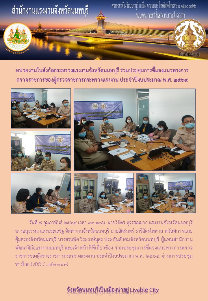 วันที่ 8 กุมภาพันธ์ 2564 เวลา 13.30น. นายวิชิตร สุวรรณมาก แรงงานจังหวัดนนทบุรี นางอนุวรรณ แสงประเสริฐ จัดหางานจังหวัดนนทบุรี นายอัครินทร์ ธารีฉัตรไพศาล สวัสดิการและคุ้มครองจังหวัดนนทบุรี นางชวนพิศ วิระวงษ์นุสร ประกันสังคมจังหวัดนนทบุรี ผู้แทนสำนักงานพัฒนาฝีมือแรงงานนนทบุรี และเจ้าหน้าที่ที่เกี่ยวข้อง ร่วมประชุมการชี้แจงแนวทางการตรวจราชการของผู้ตรวจราชการกระทรวงแรงงาน ประจำปีงบประมาณ พ.ศ. 2564 ผ่านการประชุมทางไกล (VDO Conference)