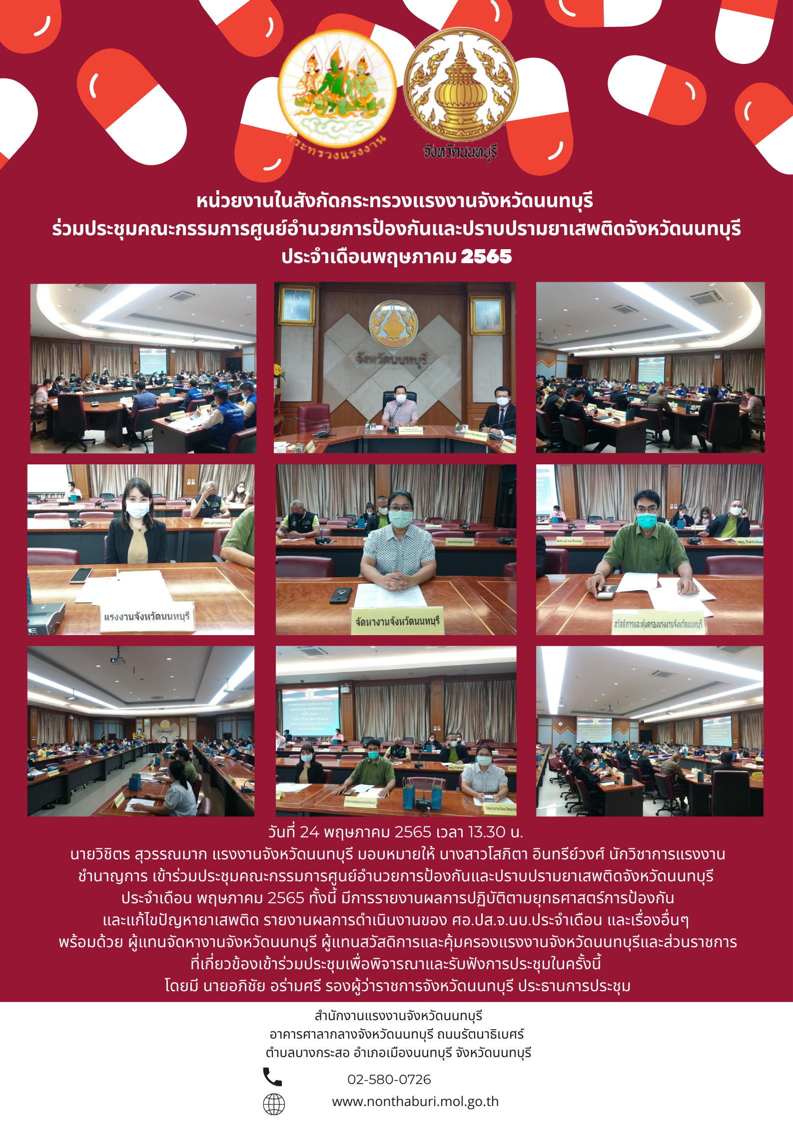 วันที่ 24 พฤษภาคม 2565 เวลา 13.30 น. นายวิชิตร สุวรรณมาก แรงงานจังหวัดนนทบุรี มอบหมายให้ นางสาวโสภิตา อินทรีย์วงศ์ นักวิชาการแรงงานชำนาญการ เข้าร่วมประชุมคณะกรรมการศูนย์อำนวยการป้องกันและปราบปรามยาเสพติดจังหวัดนนทบุรี ประจำเดือน พฤษภาคม 2565 ทั้งนี้ มีการรายงานผลการปฏิบัติตามยุทธศาสตร์การป้องกันและแก้ไขปัญหายาเสพติด รายงานผลการดำเนินงานของ ศอ.ปส.จ.นบ.ประจำเดือน และเรื่องอื่นๆ พร้อมด้วย ผู้แทนจัดหางานจังหวัดนนทบุรี ผู้แทนสวัสดิการและคุ้มครองแรงงานจังหวัดนนทบุรีและส่วนราชการที่เกี่ยวข้องเข้าร่วมประชุมเพื่อพิจารณาและรับฟังการประชุมในครั้งนี้ โดยมี นายอภิชัย อร่ามศรี รองผู้ว่าราชการจังหวัดนนทบุรี ประธานการประชุม