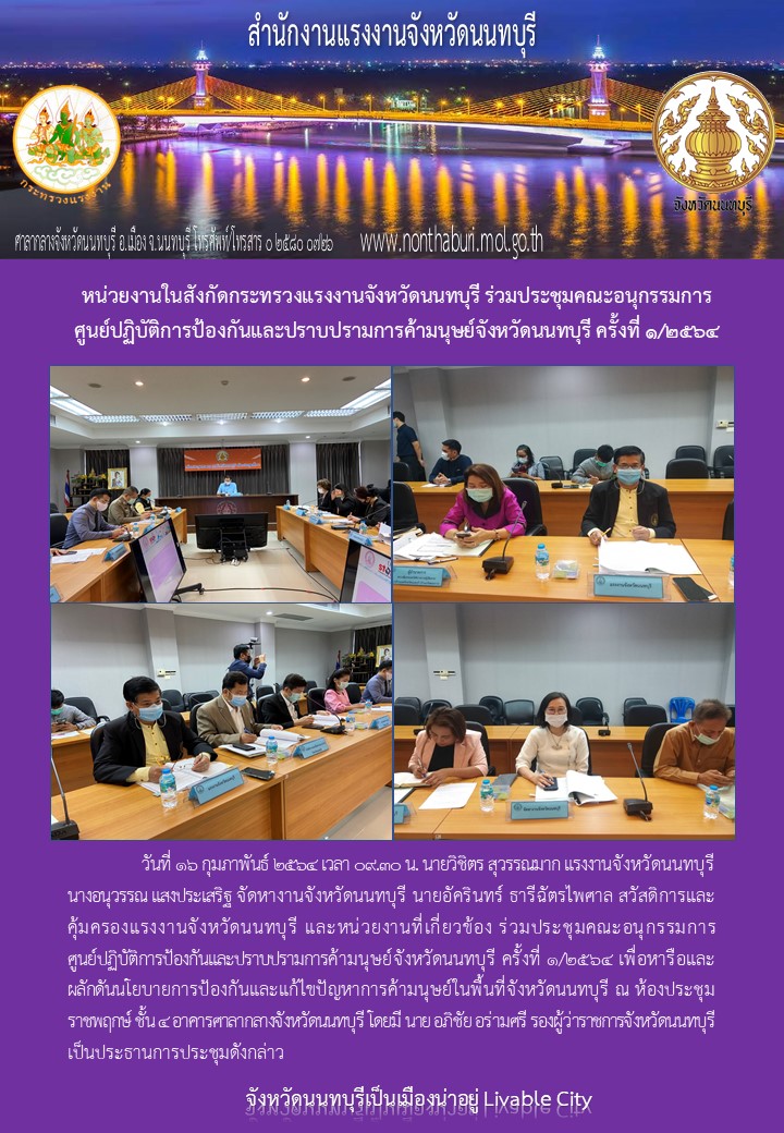 วันที่ 16 กุมภาพันธ์ 2564 เวลา 09.30 น. นายวิชิตร สุวรรณมาก แรงงานจังหวัดนนทบุรี นางอนุวรรณ แสงประเสริฐ จัดหางานจังหวัดนนทบุรี นายอัครินทร์ ธารีฉัตรไพศาล สวัสดิการและคุ้มครองแรงงานจังหวัดนนทบุรี และหน่วยงานที่เกี่ยวข้อง ร่วมประชุมคณะอนุกรรมการศูนย์ปฏิบัติการป้องกันและปราบปรามการค้ามนุษย์จังหวัดนนทบุรี ครั้งที่ 1/2564 เพื่อหารือและผลักดันนโยบายการป้องกันและแก้ไขปัญหาการค้ามนุษย์ในพื้นที่จังหวัดนนทบุรี ณ ห้องประชุมราชพฤกษ์ ชั้น 4 อาคารศาลากลางจังหวัดนนทบุรี โดยมี นาย อภิชัย อร่ามศรี รองผู้ว่าราชการจังหวัดนนทบุรี เป็นประธานการประชุมดังกล่าว