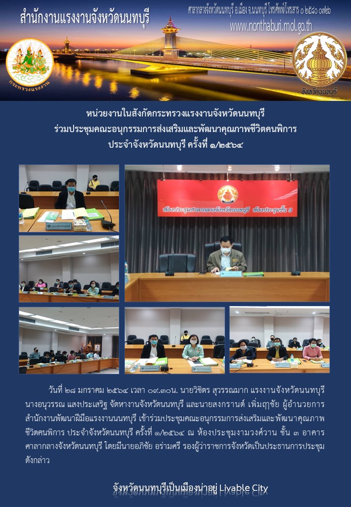 วันที่ 28 มกราคม 2564 เวลา 09.30น. นายวิชิตร สุวรรณมาก แรงงานจังหวัดนนทบุรี นางอนุวรรณ แสงประเสริฐ จัดหางานจังหวัดนนทบุรี และนายสงกรานต์ เพิ่มฤๅชัย ผู้อำนวยการสำนักงานพัฒนาฝีมือแรงงานนนทบุรี เข้าร่วมประชุมคณะอนุกรรมการส่งเสริมและพัฒนาคุณภาพชีวิตคนพิการ ประจำจังหวัดนนทบุรี ครั้งที่ 1/2564 ณ ห้องประชุมงามวงศ์วาน ชั้น 3 อาคาร ศาลากลางจังหวัดนนทบุรี โดยมีนายอภิชัย อร่ามศรี รองผู้ว่าราชการจังหวัดเป็นประธานการประชุมดังกล่าว