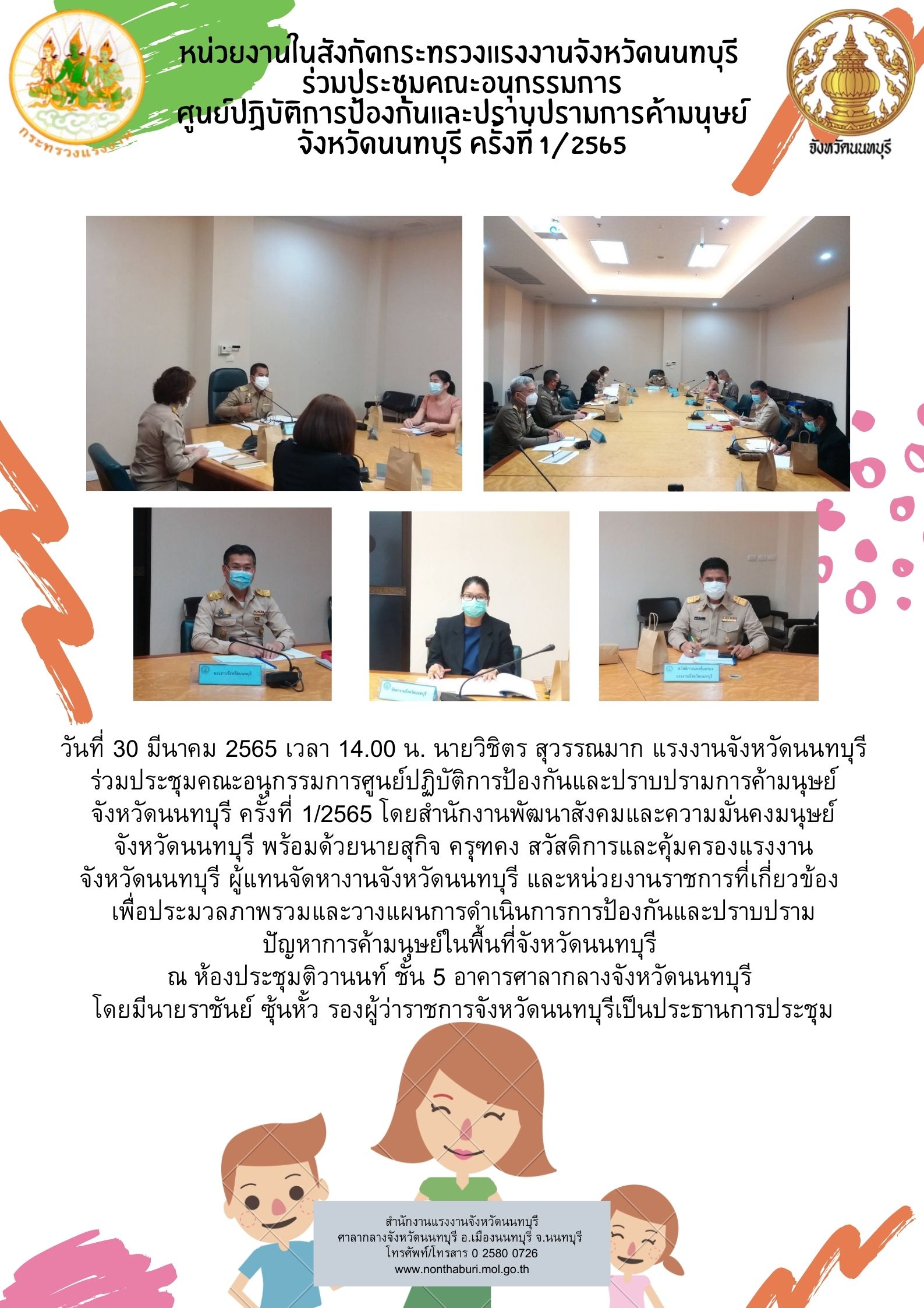 วันที่ 30 มีนาคม 2565 เวลา 14.00 น. นายวิชิตร สุวรรณมาก แรงงานจังหวัดนนทบุรี ร่วมประชุมคณะอนุกรรมการศูนย์ปฏิบัติการป้องกันและปราบปรามการค้ามนุษย์จังหวัดนนทบุรี ครั้งที่ 1/2565 โดยสำนักงานพัฒนาสังคมและความมั่นคงมนุษย์จังหวัดนนทบุรี พร้อมด้วยนายสุกิจ ครุฑคง สวัสดิการและคุ้มครองแรงงานจังหวัดนนทบุรี ผู้แทนจัดหางานจังหวัดนนทบุรี และหน่วยงานราชการที่เกี่ยวข้องเพื่อประมวลภาพรวมและวางแผนการดำเนินการการป้องกันและปราบปรามปัญหาการค้ามนุษย์ในพื้นที่จังหวัดนนทบุรี ณ ห้องประชุมติวานนท์ ชั้น 5 อาคารศาลากลางจังหวัดนนทบุรี โดยมีนายราชันย์ ซุ้นหั้ว รองผู้ว่าราชการจังหวัดนนทบุรี เป็นประธานการประชุม
