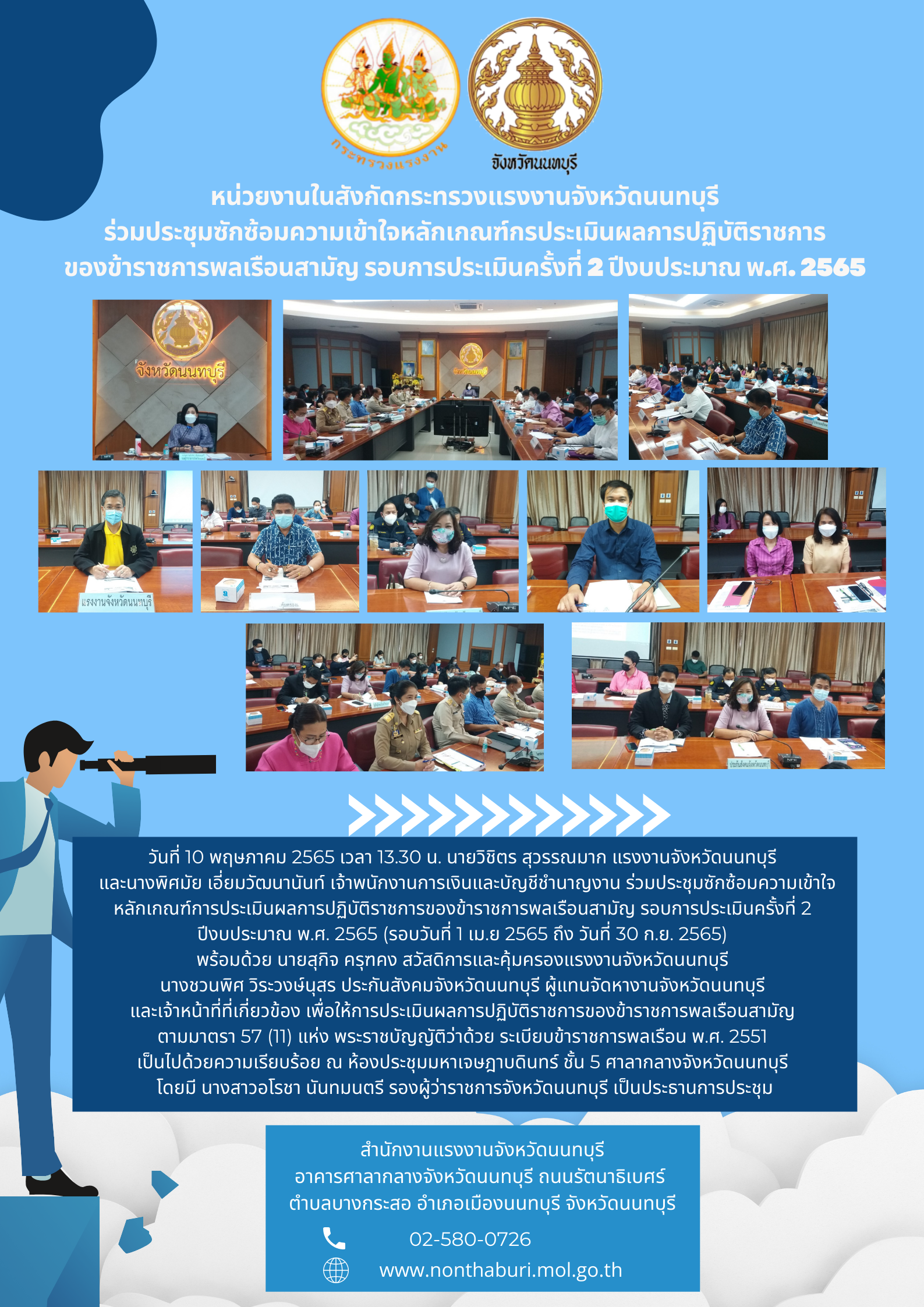 วันที่ 10 พฤษภาคม 2565 เวลา 13.30 น. นายวิชิตร สุวรรณมาก แรงงานจังหวัดนนทบุรี และนางพิศมัย เอี่ยมวัฒนานันท์ เจ้าพนักงานการเงินและบัญชีชำนาญงาน ร่วมประชุมซักซ้อมความเข้าใจหลักเกณฑ์การประเมินผลการปฏิบัติราชการของข้าราชการพลเรือนสามัญ รอบการประเมินครั้งที่ 2 ปีงบประมาณ พ.ศ. 2565 (รอบวันที่ 1 เม.ย 2565 ถึง วันที่ 30 ก.ย. 2565) พร้อมด้วยนายสุกิจ ครุฑคง สวัสดิการและคุ้มครองแรงงานจังหวัดนนทบุรีนางชวนพิศ วิระวงษ์นุสร ประกันสังคมจังหวัดนนทบุรี ผู้แทนจัดหางานจังหวัดนนทบุรี และเจ้าหน้าที่ที่เกี่ยวข้อง เพื่อให้การประเมินผลการปฏิบัติราชการของข้าราชการพลเรือนสามัญ ตามมาตรา 57 (11) แห่งพระราชบัญญัติว่าด้วย ระเบียบข้าราชการพลเรือน พ.ศ. 2551เป็นไปด้วยความเรียบร้อย ณ ห้องประชุมมหาเจษฎาบดินทร์ ชั้น 5 ศาลากลางจังหวัดนนทบุรี โดยมี นางสาวอโรชา นันทมนตรี รองผู้ว่าราชการจังหวัดนนทบุรี เป็นประธานการประชุม