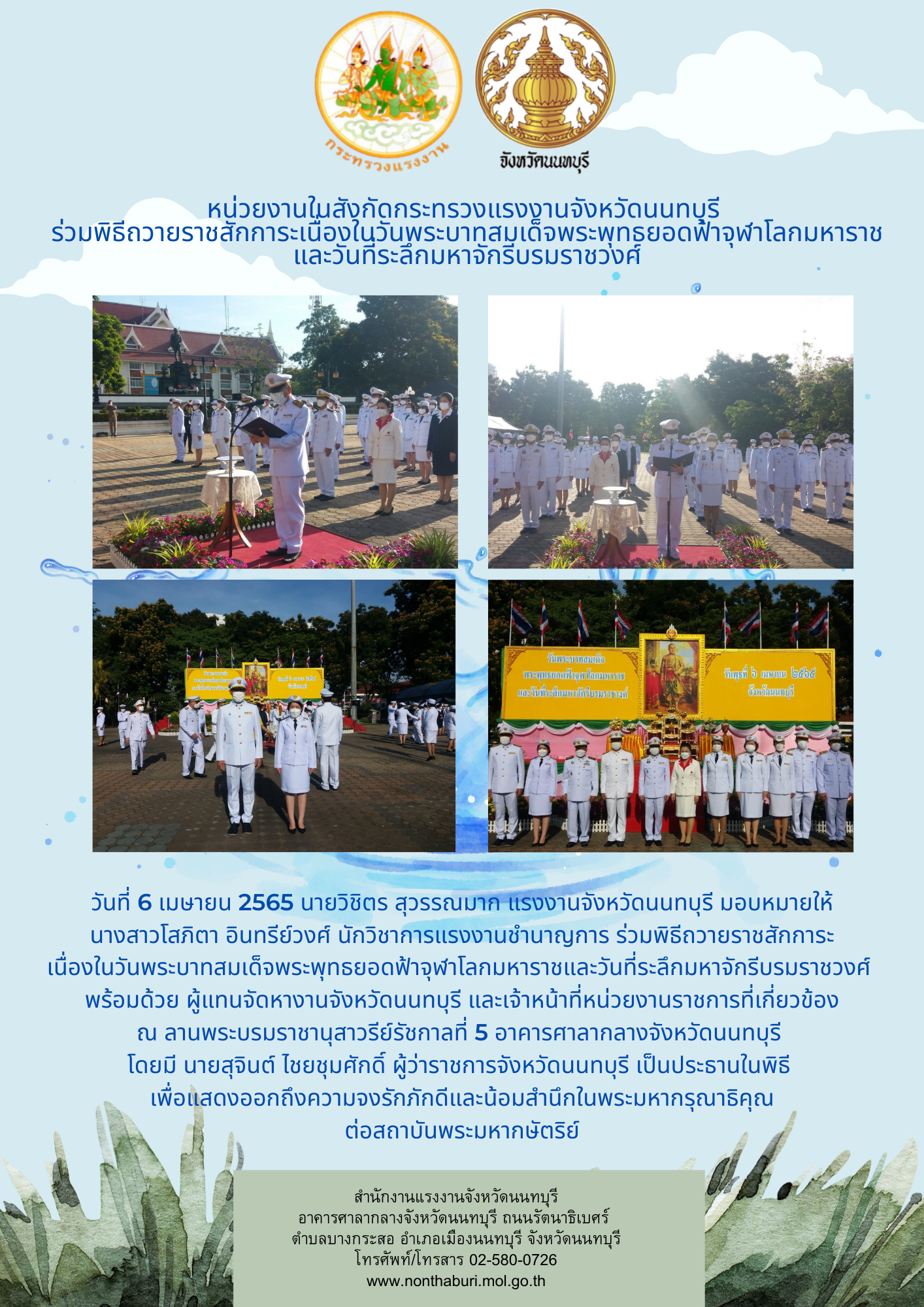 วันที่ 6 เมษายน 2565 นายวิชิตร สุวรรณมาก แรงงานจังหวัดนนทบุรี มอบหมายให้ นางสาวโสภิตา อินทรีย์วงศ์ นักวิชาการแรงงานชำนาญการ ร่วมพิธีถวายราชสักการะ เนื่องในวันพระบาทสมเด็จพระพุทธยอดฟ้าจุฬาโลกมหาราชและวันที่ระลึกมหาจักรีบรมราชวงศ์ พร้อมด้วย ผู้แทนจัดหางานจังหวัดนนทบุรี และเจ้าหน้าที่หน่วยงานราชการที่เกี่ยวข้อง ณ ลานพระบรมราชานุสาวรีย์รัชกาลที่ 5 อาคารศาลากลางจังหวัดนนทบุรี โดยมี นายสุจินต์ ไชยชุมศักดิ์ ผู้ว่าราชการจังหวัดนนทบุรี เป็นประธานในพิธี เพื่อแสดงออกถึงความจงรักภักดีและน้อมสำนึกในพระมหากรุณาธิคุณต่อสถาบันพระมหากษัตริย์