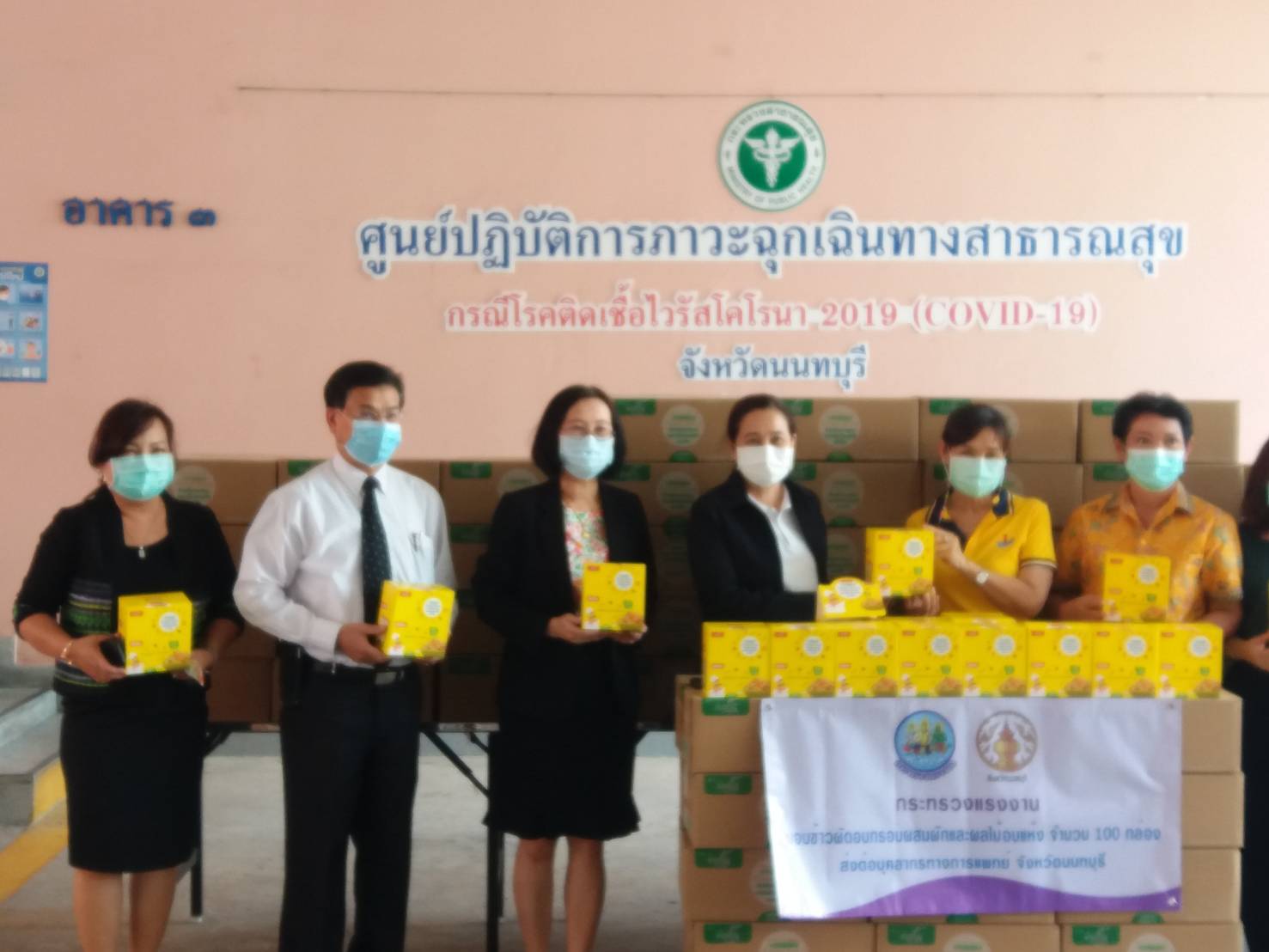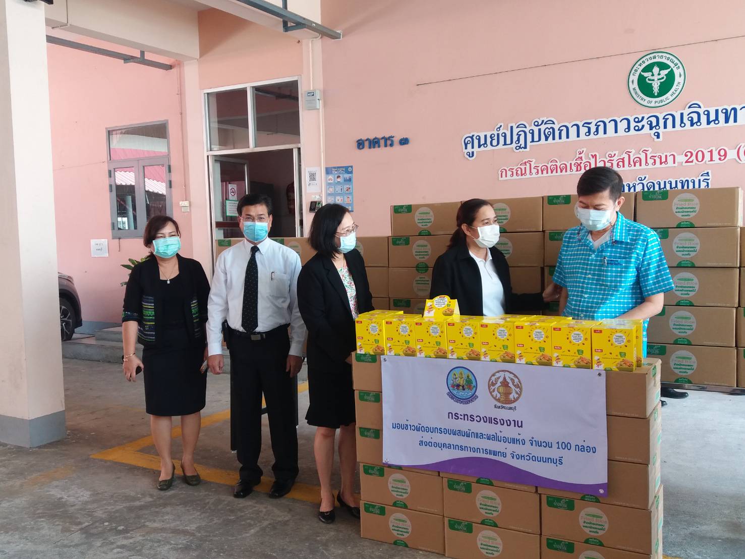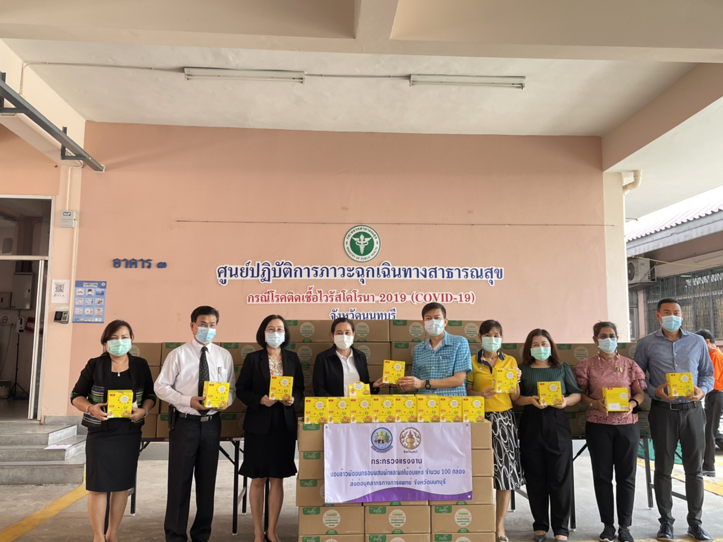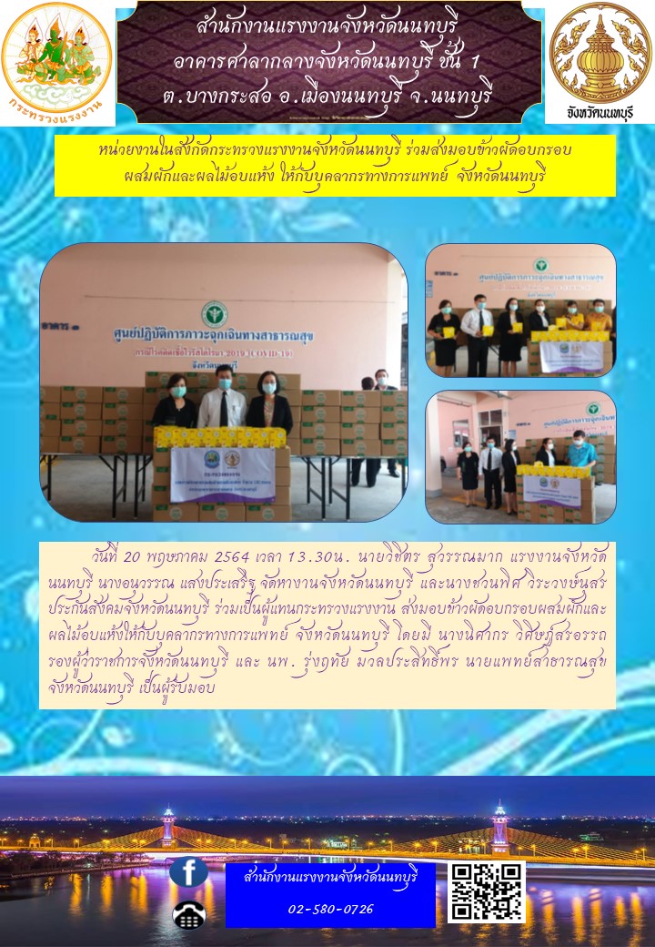 วันที่ 20 พฤษภาคม 2564 เวลา 13.30น. นายวิชิตร สุวรรณมาก แรงงานจังหวัดนนทบุรี นางอนุวรรณ แสงประเสริฐ จัดหางานจังหวัดนนทบุรี และนางชวนพิศ วิระวงษ์นุสร ประกันสังคมจังหวัดนนทบุรี ร่วมเป็นผู้แทนกระทรวงแรงงาน ส่งมอบข้าวผัดอบกรอบผสมผักและผลไม้อบแห้งให้กับบุคลากรทางการแพทย์ จังหวัดนนทบุรี โดยมี นางนิศากร วิศิษฏ์สรอรรถ รองผู้ว่าราชการจังหวัดนนทบุรี และ นพ. รุ่งฤทัย มวลประสิทธิ์พร นายแพทย์สาธารณสุข จังหวัดนนทบุรี เป็นผู้รับมอบ