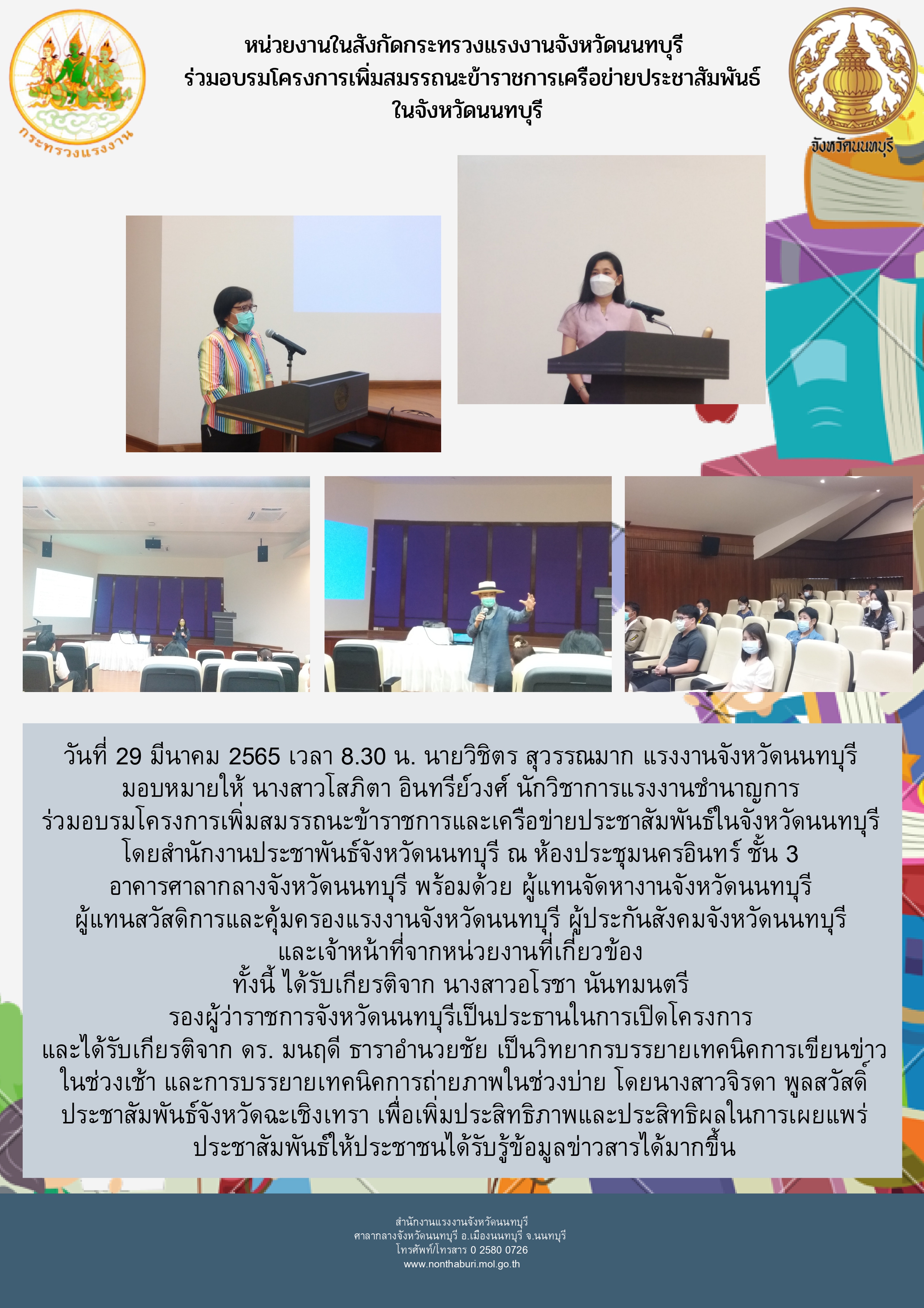 วันที่ 29 มีนาคม 2565 เวลา 8.30 น. นายวิชิตร สุวรรณมาก แรงงานจังหวัดนนทบุรี มอบหมายให้ นางสาวโสภิตา อินทรีย์วงศ์ นักวิชาการแรงงานชำนาญการ ร่วมอบรมโครงการเพิ่มสมรรถนะข้าราชการและเครือข่ายประชาสัมพันธ์ในจังหวัดนนทบุรี โดยสำนักงานประชาสัมพันธ์จังหวัดนนทบุรี ณ ห้องประชุมนครอินทร์ ชั้น 3 อาคารศาลากลางจังหวัดนนทบุรี พร้อมด้วย ผู้แทนจัดหางานจังหวัดนนทบุรี ผู้แทนสวัสดิการและคุ้มครองแรงงานจังหวัดนนทบุรี ผู้ประกันสังคมจังหวัดนนทบุรี และเจ้าหน้าที่จากหน่วยงานที่เกี่ยวข้อง ทั้งนี้ได้รับเกียรติจาก นางสาวอโรชา นันทมนตรี รองผู้ว่าราชการจังหวัดนนทบุรีเป็นประธานในการเปิดโครงการ และได้รับเกียรติจาก ดร. มนฤดี ธาราอำนวยชัย เป็นวิทยากรบรรยายเทคนิคการเขียนข่าวในช่วงเช้า และการบรรยายเทคนิคการถ่ายภาพ ในช่วงบ่าย โดยนางสาวจิรดา พูลสวัสดิ์ ประชาสัมพันธ์จังหวัดฉะเชิงเทรา เพื่อเพิ่มประสิทธิภาพและประสิทธิผลในการเผยแพร่ประชาสัมพันธ์ให้ประชาชนได้รับรู้ข้อมูลข่าวสารได้มากขึ้น