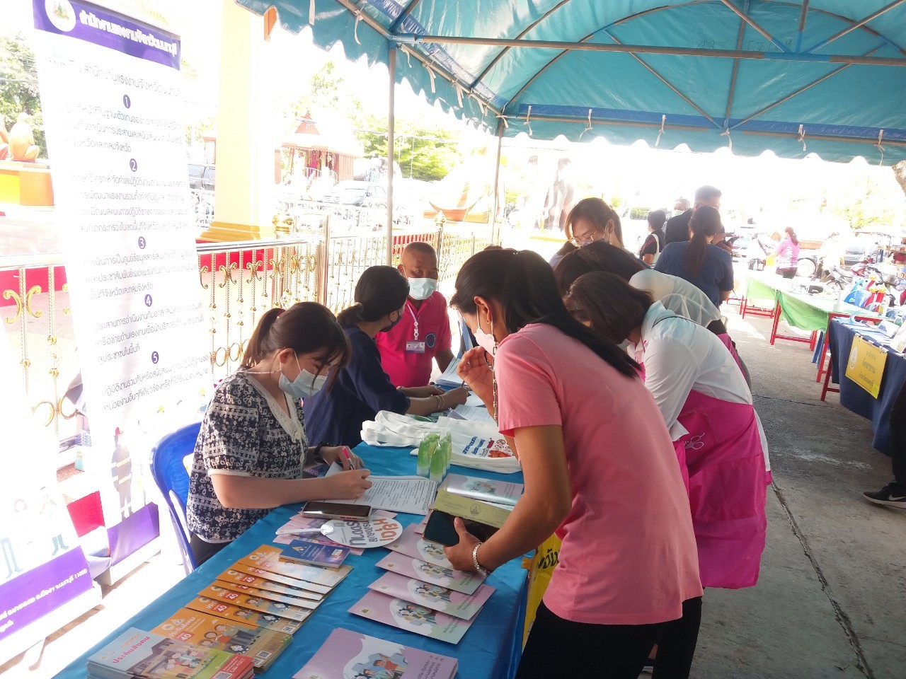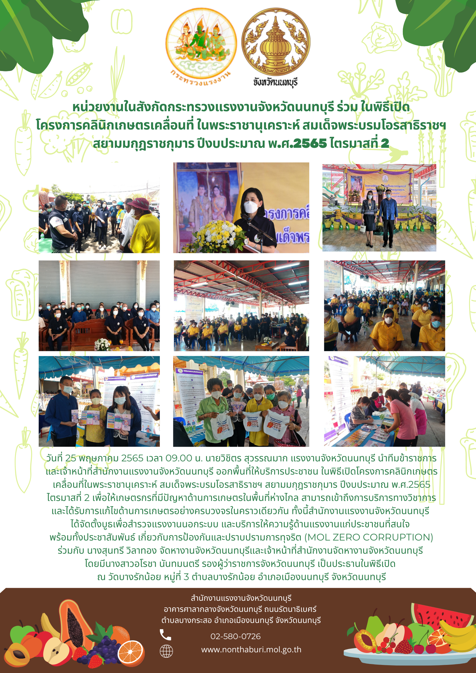 วันที่ 25 พฤษภาคม 2565 เวลา 09.00 น. นายวิชิตร สุวรรณมาก แรงงานจังหวัดนนทบุรี นำทีมข้าราชการ และเจ้าหน้าที่สำนักงานแรงงานจังหวัดนนทบุรี ออกพื้นที่ให้บริการประชาชน ในพิธีเปิดโครงการคลินิกเกษตรเคลื่อนที่ในพระราชานุเคราะห์ สมเด็จพระบรมโอรสาธิราชฯ สยามมกุฎราชกุมาร ปีงบประมาณ พ.ศ.2565 ไตรมาสที่ 2 เพื่อให้เกษตรกรที่มีปัญหาด้านการเกษตรในพื้นที่ห่างไกล สามารถเข้าถึงการบริการทางวิชาการ และได้รับการแก้ไขด้านการเกษตรอย่างครบวงจรในคราวเดียวกัน ทั้งนี้สำนักงานแรงงานจังหวัดนนทบุรี ได้จัดตั้งบูธเพื่อสำรวจแรงงานนอกระบบ และบริการให้ความรู้ด้านแรงงานแก่ประชาชนที่สนใจ พร้อมทั้งประชาสัมพันธ์ เกี่ยวกับการป้องกันและปราบปรามการทุจริต (MOL ZERO CORRUPTION) ร่วมกับ นางสุนทรี วิลาทอง จัดหางานจังหวัดนนทบุรีและเจ้าหน้าที่สำนักงานจัดหางานจังหวัดนนทบุรี โดยมีนางสาวอโรชา นันทมนตรี รองผู้ว่าราชการจังหวัดนนทบุรี เป็นประธานในพิธีเปิด ณ วัดบางรักน้อย หมู่ที่ 3 ตำบลบางรักน้อย อำเภอเมืองนนทบุรี จังหวัดนนทบุรี