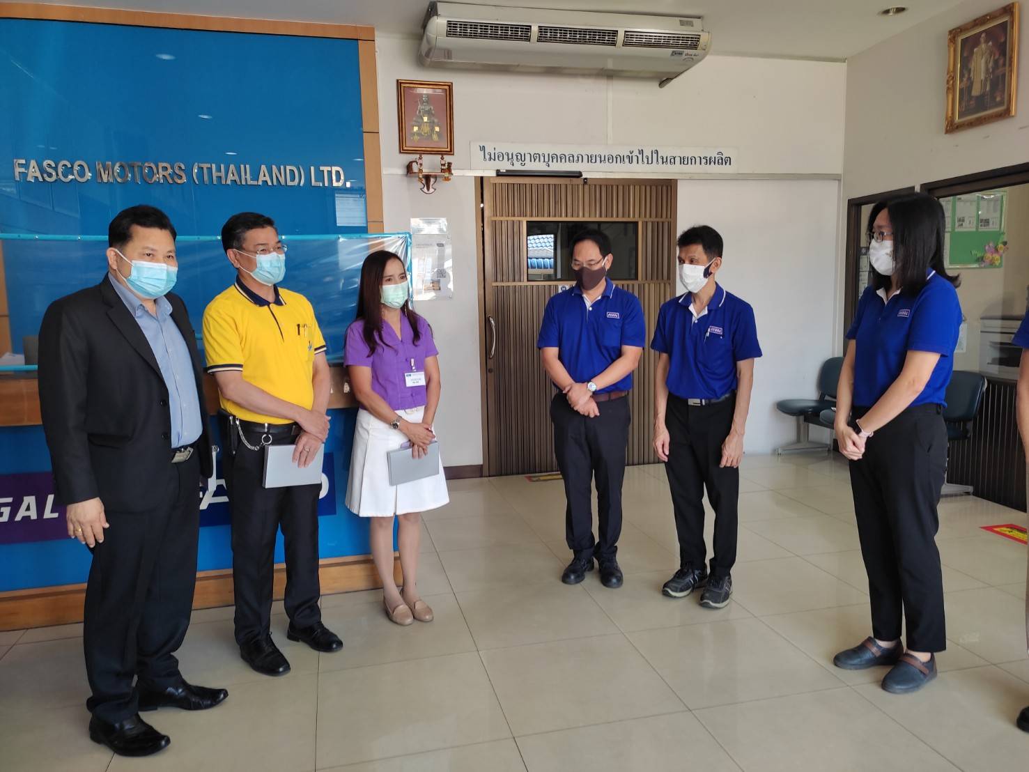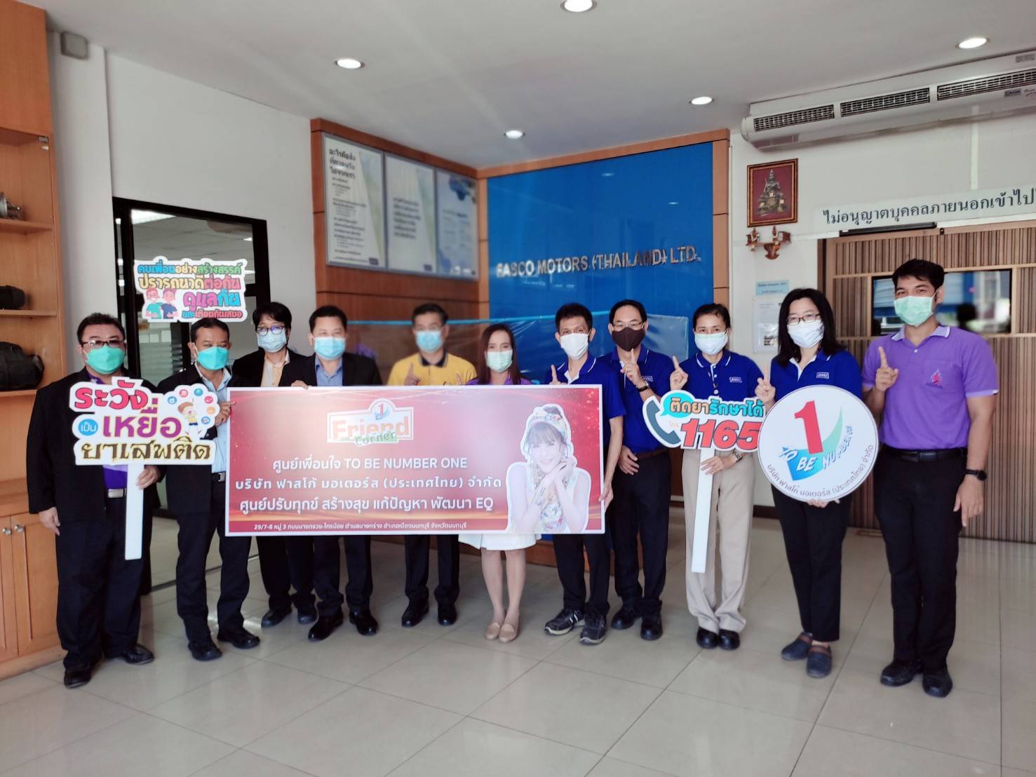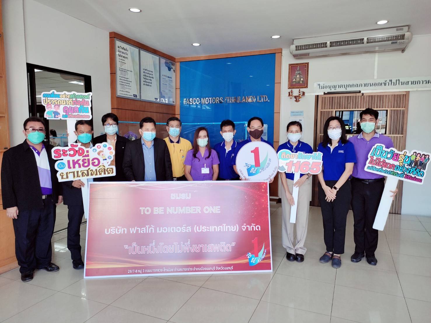 วันที่ 29 กันยายน 2564 นายวิชิตร สุวรรณมาก แรงงานจังหวัดนนทบุรี นายอัครินทร์ ธารีฉัตรไพศาล สวัสดิการและคุ้มครองแรงงานจังหวัดนนทบุรี ผู้แทนประกันสังคมจังหวัดนนทบุรี ผู้แทนผู้อำนวยการสำนักงานพัฒนาฝีมือแรงงานนนทบุรี และเจ้าหน้าที่ที่เกี่ยวข้อง ลงพื้นที่ให้ความรู้ และแนะนำสถานประกอบการในเรื่องการจัดตั้งชมรม TO BE NUMBER ONE พร้อมมอบป้ายชมรมให้แก่สถานประกอบการ ณ บริษัท ฟาสโก้ มอเตอร์ส (ประเทศไทย) จำกัด ต.บางกร่าง อ. เมืองนนทบุรี จ.นนทบุรี ทั้งนี้ เจ้าหน้าที่ยังได้ดำเนินโครงการตามนโยบายที่ว่า รณรงค์ป้องกันและแก้ไขยาเสพติดในสถานประกอบการจังหวัดนนทบุรี