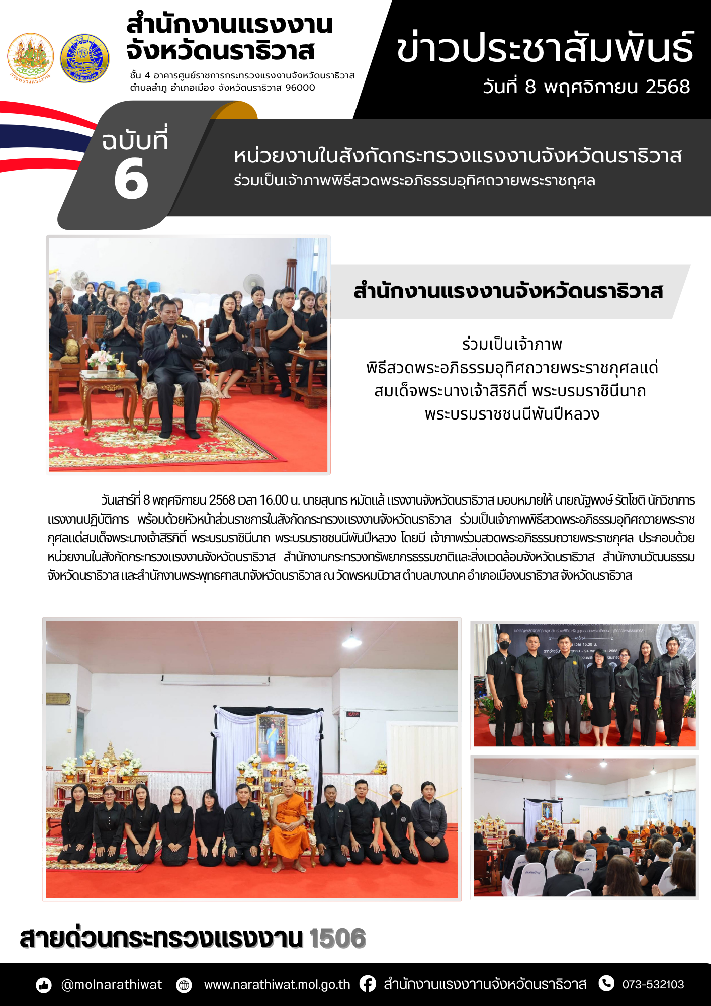 วันเสาร์ที่ 8 พฤศจิกายน 2568 เวลา 16.00 น. นายสุนทร หมัดแล้ แรงงานจังหวัดนราธิวาส มอบหมายให้ นายณัฐพงษ์ รัตโชติ นักวิชาการแรงงานปฏิบัติการ พร้อมด้วยหัวหน้าส่วนราชการในสังกัดกระทรวงแรงงานจังหวัดนราธิวาส ร่วมเป็นเจ้าภาพพิธีสวดพระอภิธรรมอุทิศถวายพระราชกุศลแด่สมเด็จพระนางเจ้าสิริกิติ์ พระบรมราชินีนาถ พระบรมราชชนนีพันปีหลวง โดยมี เจ้าภาพร่วมสวดพระอภิธรรมถวายพระราชกุศล ประกอบด้วย หน่วยงานในสังกัดกระทรวงแรงงานจังหวัดนราธิวาส สำนักงานกระทรวงทรัพยากรธรรมชาติและสิ่งแวดล้อมจังหวัดนราธิวาส สำนักงานวัฒนธรรมจังหวัดนราธิวาส และสำนักงานพระพุทธศาสนาจังหวัดนราธิวาส ณ วัดพรหมนิวาส ตำบลบางนาค อำเภอเมืองนราธิวาส จังหวัดนราธิวาส