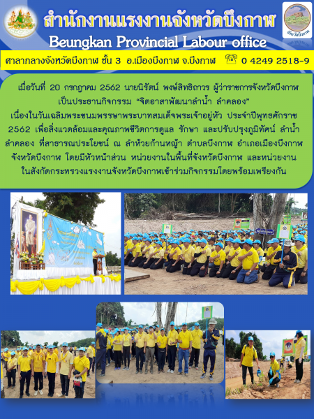 หน่วยงานในสังกัดกระทรวงแรงงานจังหวัดบึงกาฬ ร่วมกิจกรรมจิตอาสาพัฒนาลำน้ำ ลำคลอง เนื่องในวันเฉลิมพระชนมพรรษาพระบาทสมเด้จพระเจ้าอยู่หัว ปี 2562