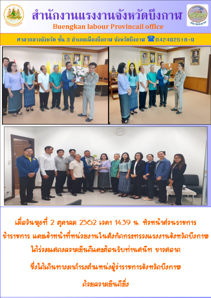 หน่วยงานในสังกัดกระทรวงแรงงานจังหวัดบึงกาฬ ร่วมต้อนรับนายสนิท ขาวสอาด ผู้ว่าราชการจังหวัดบึงกาฬคนใหม่ ด้วยความยินดียิ่ง