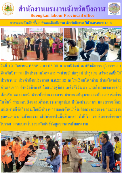 หน่วยงานในสังกัดกระทรวงแรงงานจังหวัดบึงกาฬ ร่วมโครงการ “หน่วยบำบัดทุกข์ บำรุงสุข สร้างรอยยิ้มให้ประชาชน” ประจำปีงบประมาณ พ.ศ.2562