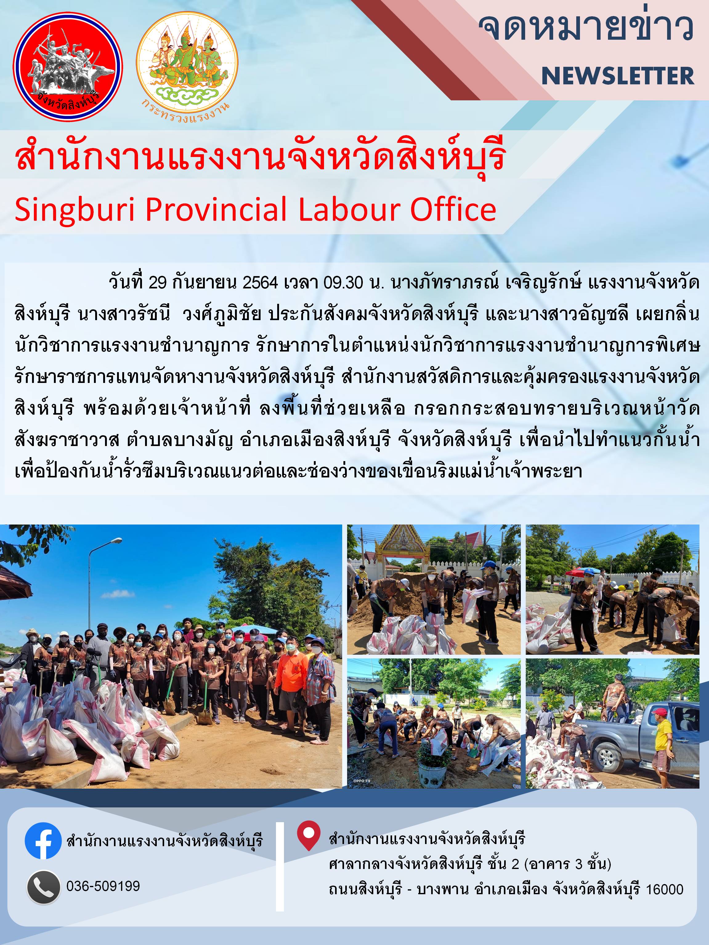 หน่วยงานในสังกัดกระทรวงแรงงานจังหวัดสิงห์บุรี ลงพื้นที่ช่วยเหลือ กรอกกระสอบทรายบริเวณหน้าวัดสังฆราชาวาส เพื่อทำเป็นแนวกั้นน้ำ เพื่อป้องกันการรั่วซึมบริเวณแนวริมเขื่อนแม่น้ำเจ้าพระยา