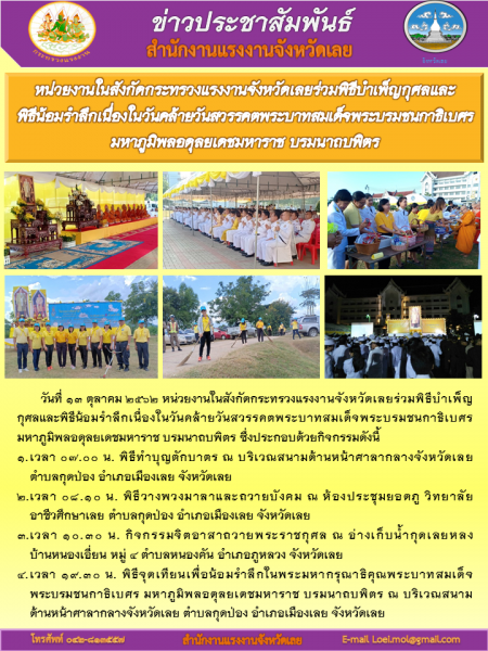 หน่วยงานในสังกัดกระทรวงแรงงานจังหวัดเลยร่วมพิธีบำเพ็ญกุศลและพิธีน้อมรำลึกเนื่องในวันคล้ายวันสวรรคตพระบาทสมเด็จพระบรมชนกาธิเบศร มหาภูมิพลอดุลยเดชมหาราชบรมนาถบพิตร