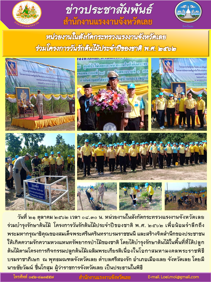 หน่วยงานในสังกัดกระทรวงแรงงานจังหวัดเลย ร่วมโครงการวันรักต้นไม้ประจำปีของชาติ พ.ศ. 2562 ณ พุทธมณฑลจังหวัดเลย ตำบลศรีสองรัก อำเภอเมืองเลย จังหวัดเลย