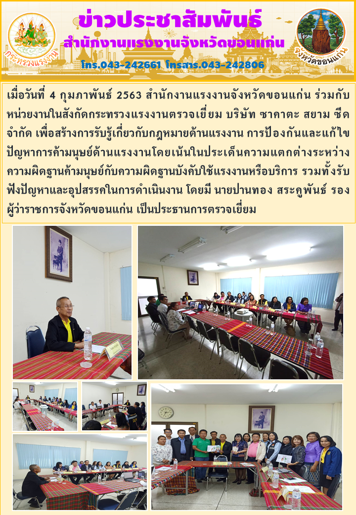 เมื่อวันที่ 4 กุมภาพันธ์ 2563 สำนักงานแรงงานจังหวัดขอนแก่น ร่วมกับหน่วยงานในสังกัดกระทรวงแรงงานตรวจเยี่ยม บริษัท ซาคาตะสยาม ซีด จำกัด เพื่อสร้างการรับรู้เกี่ยวกับกฎหมายด้านแรงงาน การป้องกันและแก้ไขปัญหาการค้ามนุษย์ด้านแรงงานโดยเน้นในประเด็นความแตกต่างระหว่างความผิดฐานค้ามนุษย์กับความผิดฐานบังคับใช้แรงงานหรือบริการ รวมทั้งรับฟังปัญหาและอุปสรรคในการดำเนินงาน โดยมี นายปานทอง สระคูพันธ์ รองผู้ว่าราชการจังหวัดขอนแก่น เป็นประธานการตรวจเยี่ยม