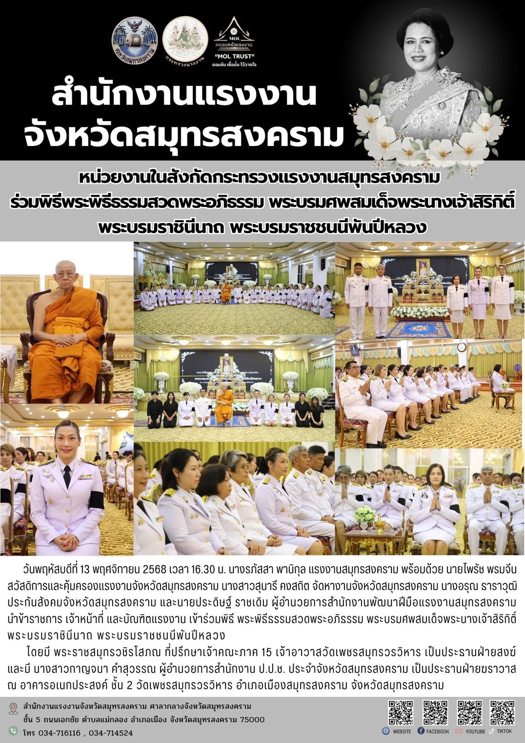 วันพฤหัสบดีที่ 13 พฤศจิกายน 2568 เวลา 16.30 น. นางรภัสสา พานิกุล แรงงานสมุทรสงคราม พร้อมด้วย นายไพรัช พรมจีน สวัสดิการและคุ้มครองแรงงานจังหวัดสมุทรสงคราม นางสาวสุนารี คงสถิต จัดหางานจังหวัดสมุทรสงคราม นางอรุณ ธาราวุฒิ ประกันสังคมจังหวัดสมุทรสงคราม และนายประดิษฐ์ ราชเดิม ผู้อำนวยการสำนักงานพัฒนาฝีมือแรงงานสมุทรสงคราม นำข้าราชการ เจ้าหน้าที่ และบัณฑิตแรงงาน เข้าร่วมพิธี พระพิธีธรรมสวดพระอภิธรรม พระบรมศพสมเด็จพระนางเจ้าสิริกิติ์ พระบรมราชินีนาถ พระบรมราชชนนีพันปีหลวง