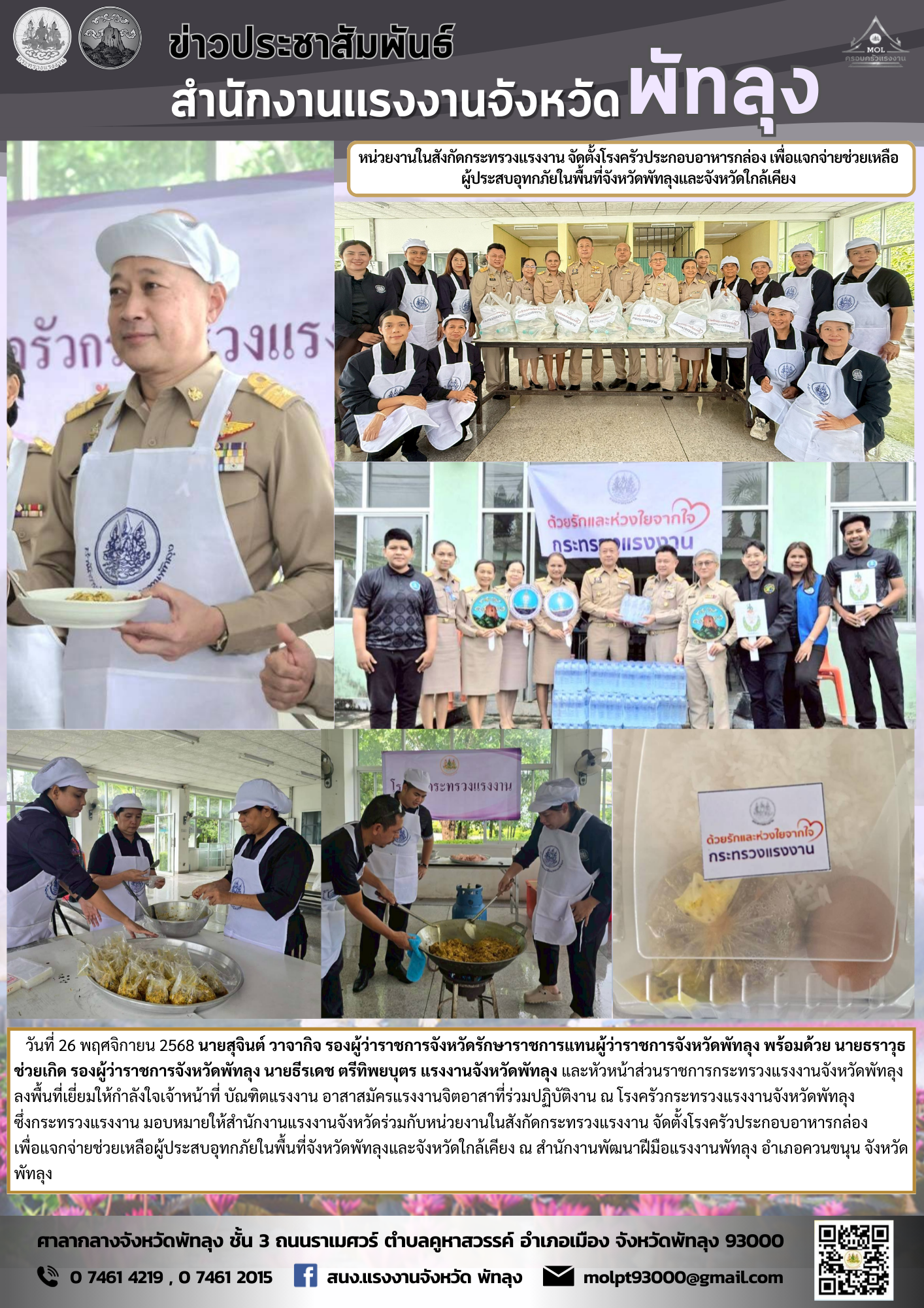วันที่ 26 พฤศจิกายน 2568 นายสุจินต์ วาจากิจ รองผู้ว่าราชการจังหวัดรักษาราชการแทนผู้ว่าราชการจังหวัดพัทลุง พร้อมด้วย นายธราวุธ ช่วยเกิด รองผู้ว่าราชการจังหวัดพัทลุง นายธีรเดช ตรีทิพยบุตร แรงงานจังหวัดพัทลุง และหัวหน้าส่วนราชการกระทรวงแรงงานจังหวัดพัทลุงลงพื้นที่เยี่ยมให้กำลังใจเจ้าหน้าที่ บัณฑิตแรงงาน อาสาสมัครแรงงานจิตอาสาที่ร่วมปฏิบัติงาน ณ โรงครัวกระทรวงแรงงานจังหวัดพัทลุง ซึ่งกระทรวงแรงงาน มอบหมายให้สำนักงานแรงงานจังหวัดร่วมกับหน่วยงานในสังกัดกระทรวงแรงงาน จัดตั้งโรงครัวประกอบอาหารกล่อง เพื่อแจกจ่ายช่วยเหลือผู้ประสบอุทกภัยในพื้นที่จังหวัดพัทลุงและจังหวัดใกล้เคียง ณ สำนักงานพัฒนาฝีมือแรงงานพัทลุง อำเภอควนขนุน จังหวัดพัทลุง