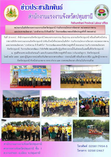 หน่วยงานในสังกัดกระทรวงแรงงานจังหวัดปทุมธานี ร่วมกิจกรรมโครงการจิตอาสา หน่วยพระราชทาน และประชาชนจิตอาสา “เราทำความ ดี ด้วยหัวใจ” กิจกรรมพัฒนาคลองรังสิตประยูรศักดิ์ (คลองสาม)