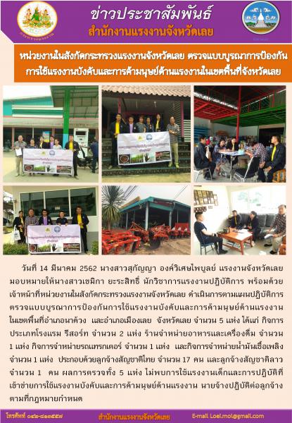 หน่วยงานในสังกัดกระทรวงแรงงานจังหวัดเลย ตรวจแบบบูรณาการป้องกันการใช้แรงงานบังคับและการค้ามนุษย์ด้านแรงงานในเขตพื้นที่จังหวัดเลย