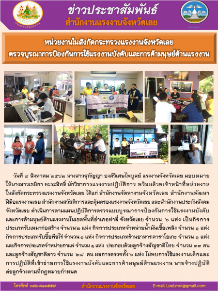 หน่วยงานในสังกัดกระทรวงแรงงานจังหวัดเลย ตรวจบูรณาการป้องกันการใช้แรงงานบังคับและการค้ามนุษย์ด้านแรงงาน