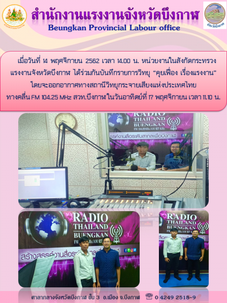 หน่วยงานในสังกัดกระทรวงแรงงานจังหวัดบึงกาฬ ร่วมบันทึกรายการวิทยุ “คุยเฟื่องเรื่องแรงงาน”