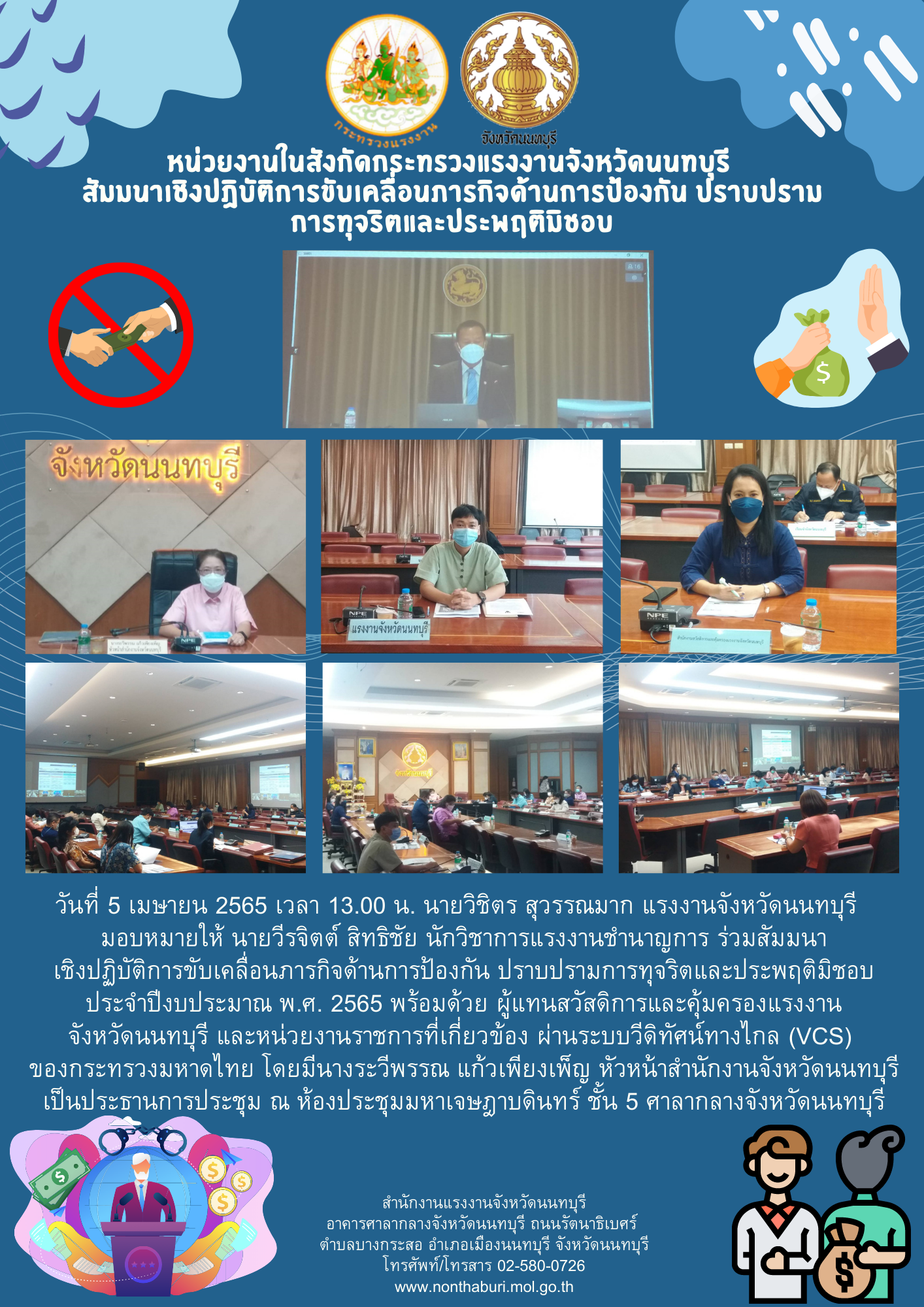 วันที่ 5 เมษายน 2565 เวลา 13.00 น. นายวิชิตร สุวรรณมาก แรงงานจังหวัดนนทบุรี มอบหมายให้ นายวีรจิตต์ สิทธิชัย นักวิชาการแรงงานชำนาญการ ร่วมสัมมนาเชิงปฏิบัติการขับเคลื่อนภารกิจด้านการป้องกัน ปราบปรามการทุจริตและประพฤติมิชอบ ประจำปีงบประมาณ พ.ศ. 2565 พร้อมด้วย ผู้แทนสวัสดิการและคุ้มครองแรงงานจังหวัดนนทบุรี และหน่วยงานราชการที่เกี่ยวข้อง ผ่านระบบวีดิทัศน์ทางไกล (VCS) ของกระทรวงมหาดไทย โดยมีนางระวีพรรณ แก้วเพียงเพ็ญ หัวหน้าสำนักงานจังหวัดนนทบุรี เป็นประธานการประชุม ณ ห้องประชุมมหาเจษฎาบดินทร์ ชั้น 5 ศาลากลางจังหวัดนนทบุรี
