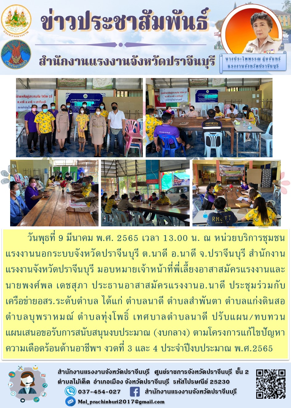 วันพุธที่ 9 มีนาคม พ.ศ. 2565 เวลา 13.00 น. ณ หน่วยบริการชุมชนแรงงานนอกระบบจังหวัดปราจีนบุรี ต.นาดี อ.นาดี จ.ปราจีนบุรี สำนักงานแรงงานจังหวัดปราจีนบุรี มอบหมายเจ้าหน้าที่พี่เลี้ยงอาสาสมัครแรงงานและนายพงศ์พล เดชสุภา ประธานอาสาสมัครแรงงานอ.นาดี ประชุมร่วมกับเครือข่ายอสร.ระดับตำบล ได้แก่ ตำบลนาดี ตำบลสำพันตา ตำบลแก่งดินสอ ตำบลบุพราหมณ์ ตำบลทุ่งโพธิ์ เทศบาลตำบลนาดี ปรับแผน/ทบทวนแผนเสนอขอรับการสนับสนุนงบประมาณ (งบกลาง) ตามโครงการแก้ไขปัญหาความเดือดร้อนด้านอาชีพฯ งวดที่ 3 และ 4 ประจำปีงบประมาณ พ.ศ.2565