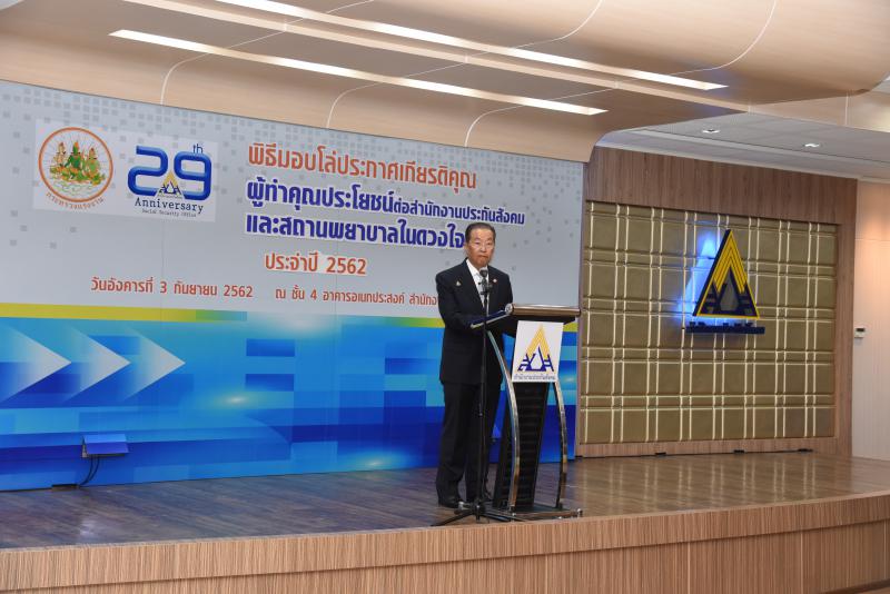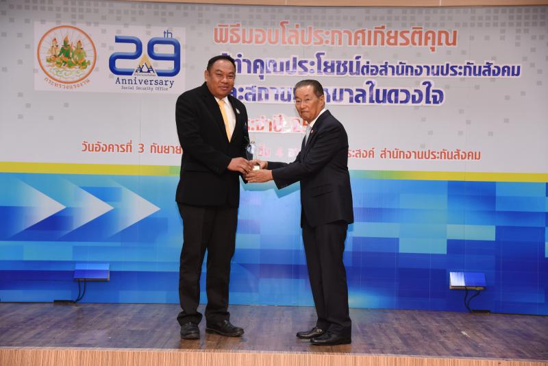 รัฐมนตรีว่าการกระทรวงแรงงาน เปิดงานวันคล้ายวันจัดตั้งสำนักงานประกันสังคม ครบรอบ 29 ปี พร้อมมอบโล่ประกาศเกียรติคุณแก่สถานประกอบการดีเด่น ผู้ทำคุณประโยชน์ต่อสำนักงาน และมอบโล่รางวัลแก่สถานพยาบาลในดวงใจ เผย ชื่นชมประกันสังคมที่พัฒนางานอย่างต่อเนื่องสู่ปีที่ 30 มุ่งเสริมสร้างหลักประกันความมั่นคงในชีวิตแก่ผู้ประกันตน