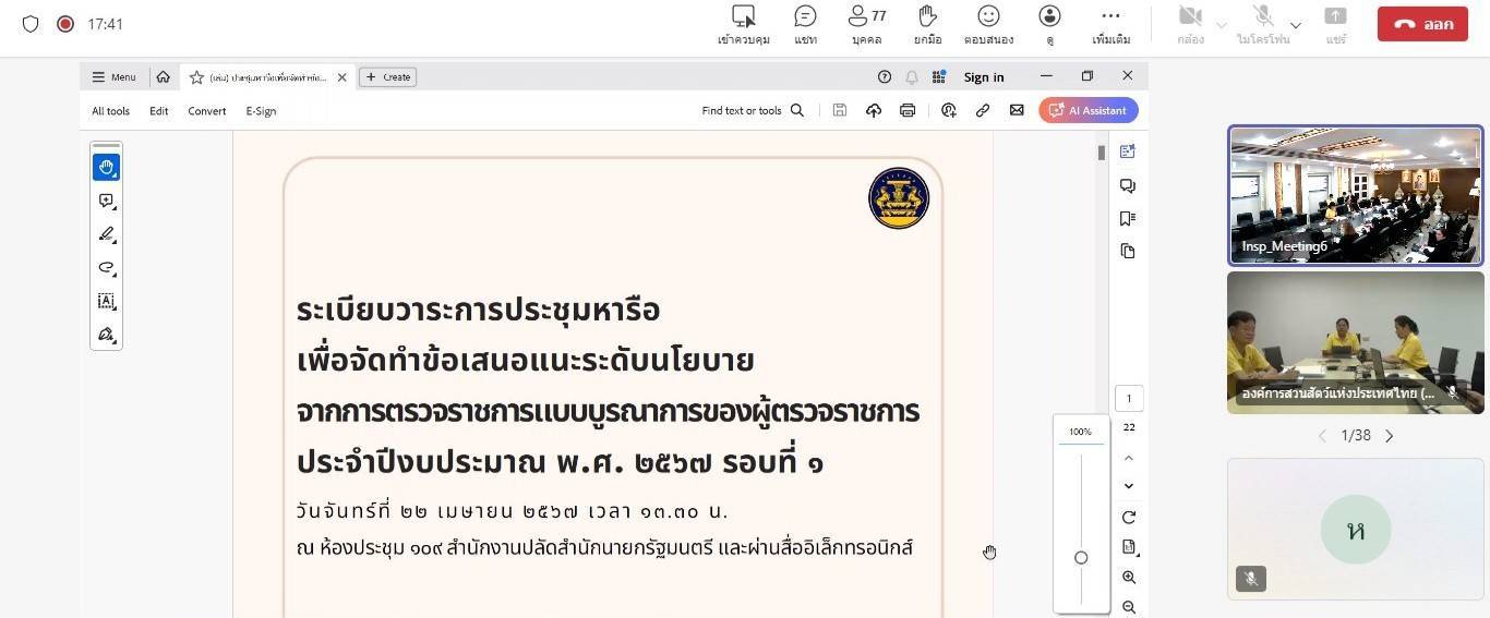 วันที่ 22 เมษายน 2567 เวลา 13.30 น. นายนันทชัย ปัญญาสุรฤทธิ์ หัวหน้าผู้ตรวจราชการกระทรวงแรงงาน ประชุมหารือเพื่อจัดทำข้อเสนอแนะระดับนโยบายจากการตรวจราชการแบบบูรณาการของผู้ตรวจราชการ ประจำปีงบประมาณ พ.ศ.2567 รอบที่ 1 ณ ห้องประชุม 109 สำนักงานปลัดสำนักนายกรัฐมนตรี ผ่านสื่ออิเล็กทรอนิกส์