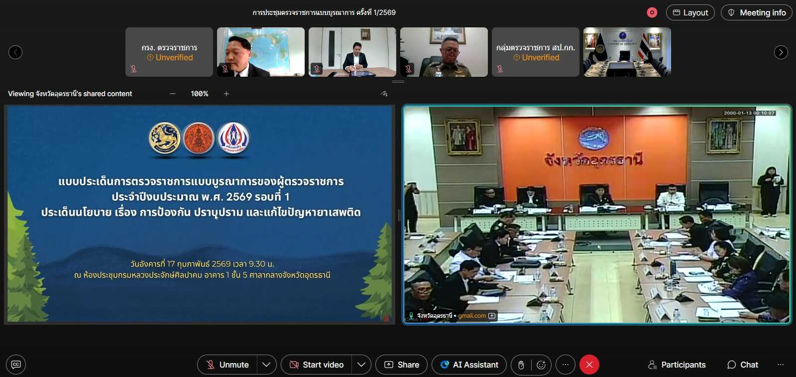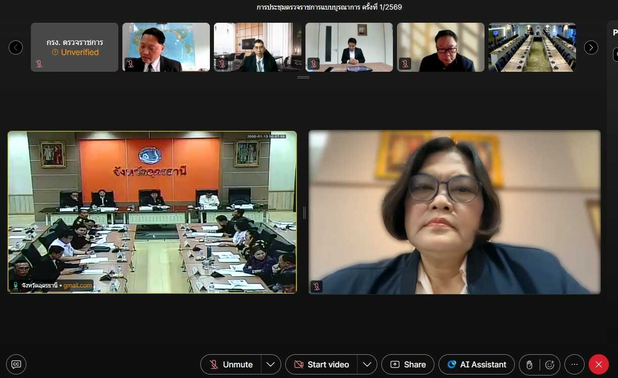 วันที่ 17 กุมภาพันธ์ 2569 เวลา 09.30 น. นางสาวบุณยวีร์ ไขว้พันธุ์ หัวหน้าผู้ตรวจราชการกระทรวงแรงงาน ร่วมประชุมการตรวจติดตามผลการดำเนินงานตามแผนการตรวจราชการแบบบูรณาการ ประจำปีงบประมาณ พ.ศ. 2569 รอบที่ 1 ของนางสุภัทร กิจเวช ผู้ตรวจราชการสำนักนายกรัฐมนตรี เขตตรวจราชการที่ 10 ร่วมกับผู้ว่าราชการจังหวัด และหัวหน้าส่วนที่เกี่ยวข้อง ผ่านระบบสื่ออิเล็กทรอนิกส์ ณ ห้องปฏิบัติราชการผู้ตรวจราชการกระทรวงแรงงาน ชั้น 8 อาคารกระทรวงแรงงาน