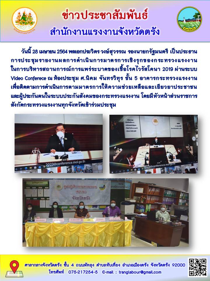 หัวหน้าส่วนราชการสังกัดกระทรวงแรงงงานในจังหวัดตรัง เข้าร่วมประชุมการรายงานผลการดำเนินการมาตรการเชิงรุกของกระทรวงแรงงานในการบริหารสถานการณ์การแพร่ระบาดของเชื้อโรคไวรัสโคโรนา 2019 ผ่านระบบ Video Conferece