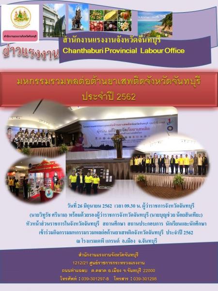 เมื่อวันที่ 26 มิ.ย. 2562 ผู้ว่าราชการจังหวัดจันทบุรี (นายวิฑูรัช ศรีนาม) พร้อมด้วยรองผู้ว่าราชการจังหวัด (นายบุญช่วย น้อยสันเทียะ) หัวหน้าส่วนราชการสังกัดกระทรวงแรงงานจังหวัดจันทบุรีเข้าร่วมกิจกรรมมหกรรมรวมพลต่อต้านยาเสพติดจังหวัดจันทบุรี ประจำปี 2562 ณ โรงแรมเคพีแกรนด์ อำเภอเมือง จังหวัดจันทบุรี
