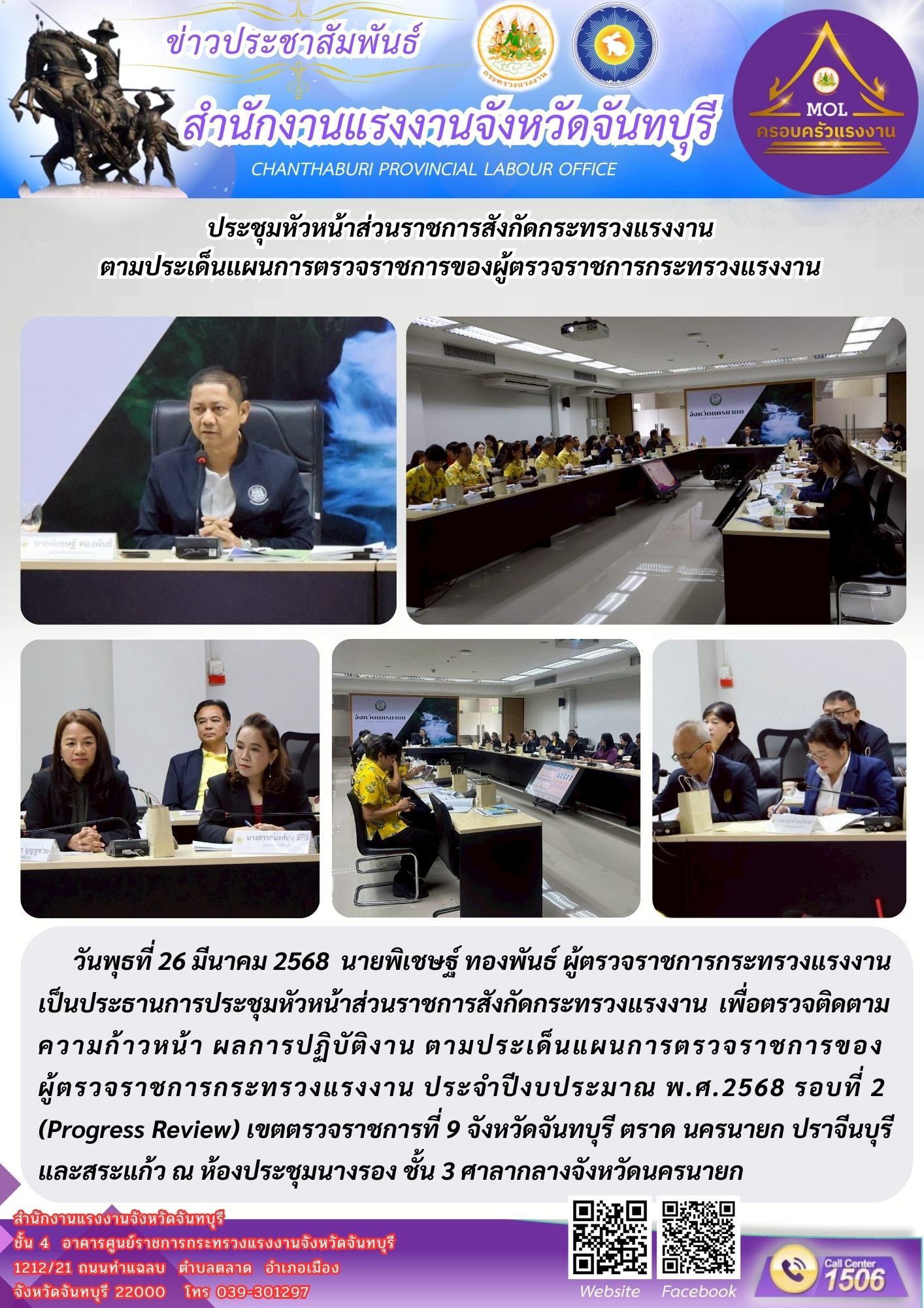 หัวหน้าส่วนราชการสังกัดกระทรวงแรงงานจังหวัดจันทบุรี ร่วมประชุมตรวจติดตาม ความก้าวหน้า ผลการปฏิบัติงาน ตามประเด็นแผนการตรวจราชการของผู้ตรวจราชการกระทรวงแรงงาน