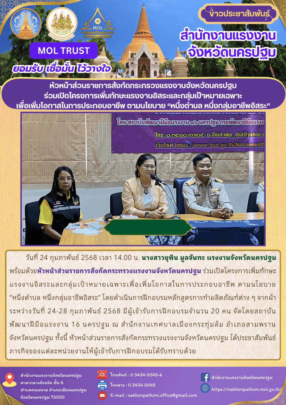 หัวหน้าส่วนราชการสังกัดกระทรวงแรงงานจังหวัดนครปฐม ร่วมเปิดโครงการเพิ่มทักษะแรงงานอิสระและกลุ่มเป้าหมายเฉพาะเพื่อเพิ่มโอกาสในการประกอบอาชีพ ตามนโยบาย “หนึ่งตำบล หนึ่งกลุ่มอาชีพอิสระ”