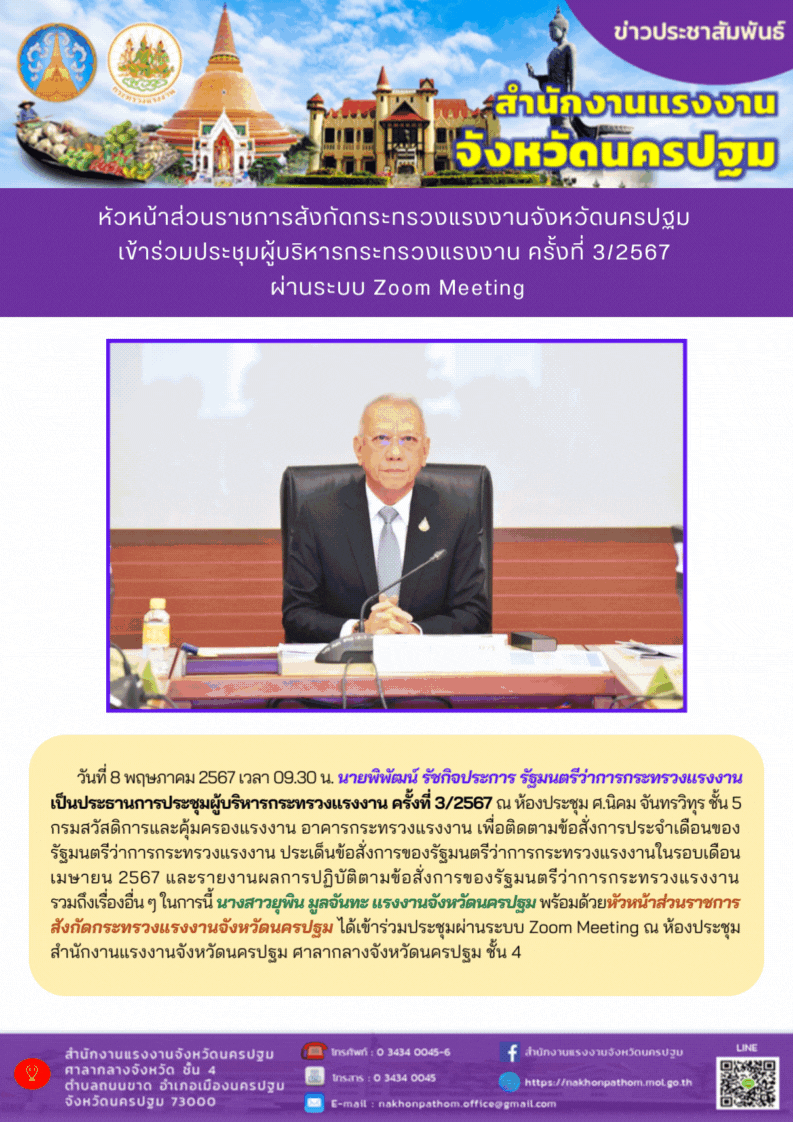 หัวหน้าส่วนราชการสังกัดกระทรวงแรงงานจังหวัดนครปฐม เข้าร่วมประชุมผู้บริหารกระทรวงแรงงาน ครั้งที่ 3/2567 ผ่านระบบ Zoom Meeting