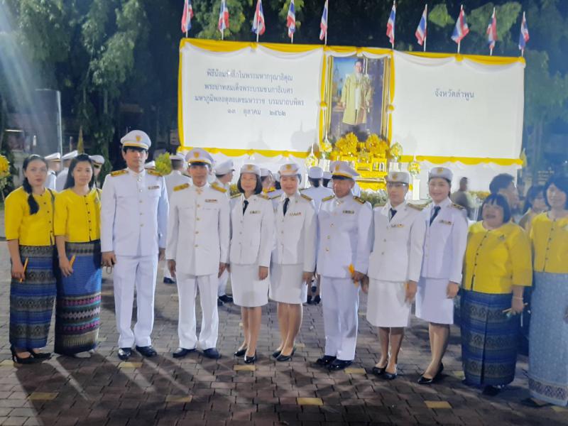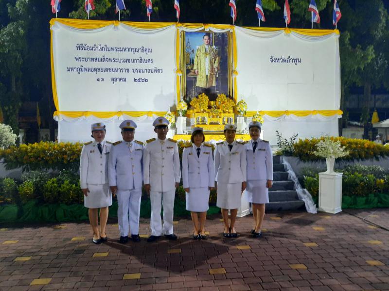 วันที่ 13 ตุลาคม 2562 (เวลา 18.30 น.) หัวหน้าส่วนราชการสังกัดกระทรวงแรงงานจังหวัดลำพูน พร้อมด้วยข้าราชการและเจ้าหน้าที่ ร่วมประกอบพิธีจุดเทียนเพื่อน้อมรำลึกในพระมหากรุณาธิคุณของพระบาทสมเด็จพระบรมชนกาธิเบศร มหาภูมิพลอดุลยเดชมหาราช บรมนาถบพิตร รัชกาลที่ 9 เนื่องในวันคล้ายวันสวรรคต ณ บริเวณลานหน้าศาลากลางจังหวัดลำพูน โดยมี นายพงศ์รัตน์ ภิรมย์รัตน์ ผู้ว่าราชการจังหวัดลำพูน เป็นประธาน