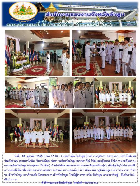 หัวหน้าส่วนราชการสังกัดกระทรวงแรงงานจังหวัดลำพูน ร่วมรับไฟหลวงพระราชทานจากสมเด็จพระเจ้าอยู่หัว เพื่ออัญเชิญไปประกอบพิธีถวายดอกไม้จันทน์ในงานพระราชทานเพลิงพระศพพระบาทสมเด็จพระปรมินทรมหาภูมิพลอดุลยเดช บรมนาถบพิตร ของจังหวัดลำพูน