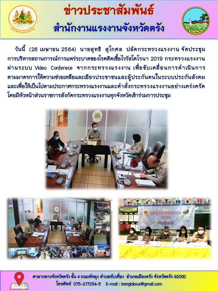 หัวหน้าส่วนราชการสังกัดกระทรวงแรงงานในจังหวัดตรังเข้าร่วมการประชุมการบริหารสถานการณ์การแพร่ระบาดของโรคติดเชื้อไวรัสโคโรนา 2019 กระทรวงแรงงาน ผ่านระบบ Video Conferece
