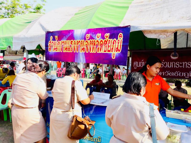วันพุธ ที่ 20 เดือนกุมภาพันธ์ พ.ศ. 2562 เวลา 09.00 น. หัวหน้าส่วนราชการสำนักงานแรงงานจังหวัดชัยภูมิและหน่วยงานในสังกัดกระทรวงแรงงานร่วมกับจังหวัดชัยภูมิออกหน่วยบริการอำนวยความสะดวกประชาชนในพื้นที่ห่างไกลเพื่อให้ได้รับข้อมูลข่าวสารของกระทรวงแรงงานในครั้งนี้ได้รับเกียรติ จากนายประทีป ศิลปเทศ รองผู้ว่าราชการจังหวัดชัยภูมิเป็นประธานในงาน ด้านสำนักงานแรงงานจังหวัดชัยภูมิ นางสาวอิสรี วีรกุลพิพัฒน์ แรงงานจังหวัดชัยภูมิ ได้จัดให้มีการฝึกอาชีพเสริมเพื่อเพิ่มรายได้ให้แก่ประชาชนในพื้นที่ โดยผู้คนต่างให้ความสนใจเป็นจำนวนมาก