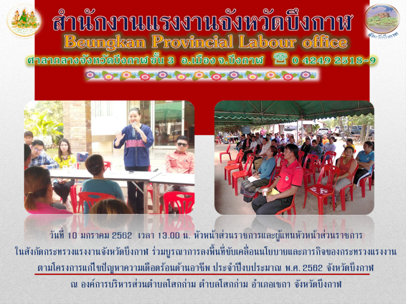 หัวหน้าส่วนราชการและผู้แทนหัวหน้าส่วนราชการในสังกัดกระทรวงแรงงานจังหวัดบึงกาฬ ร่วมบูรณาการลงพื้นที่ขับเคลื่อนนโยบายและภารกิจของกระทรวงแรงงาน ตามโครงการแก้ไขปัญหาความเดือดร้อนด้านอาชีพ ประจำปีงบประมาณ พ.ศ. 2562 จังหวัดบึงกาฬ