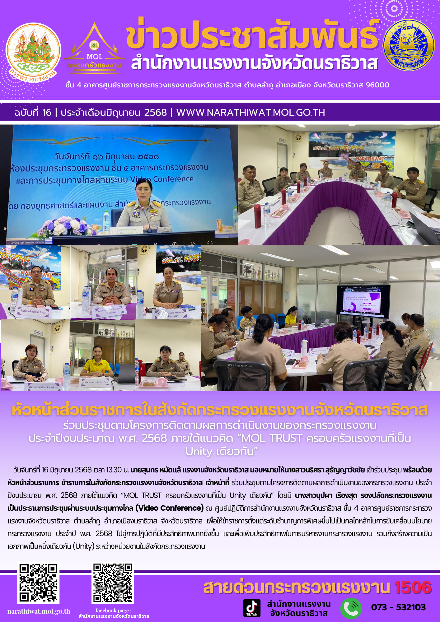 วันจันทร์ที่ 16 มิถุนายน 2568 เวลา 13.30 น. นายสุนทร หมัดแล้ แรงงานจังหวัดนราธิวาส มอบหมายให้นางสาวนริศรา สุธัญญาวัชชัย เข้าร่วมประชุม พร้อมด้วยหัวหน้าส่วนราชการ ข้าราชการในสังกัดกระทรวงแรงงานจังหวัดนราธิวาส เจ้าหน้าที่ ร่วมประชุมตามโครงการติดตามผลการดำเนินงานของกระทรวงแรงงาน ประจำปีงบประมาณ พ.ศ. 2568 ภายใต้แนวคิด “MOL TRUST ครอบครัวแรงงานที่เป็น Unity เดียวกัน” โดยมี นางสาวบุปผา เรืองสุด รองปลัดกระทรวงแรงงาน เป็นประธานการประชุมผ่านระบบประชุมทางไกล (Video Conference) ณ ศูนย์ปฏิบัติการสำนักงานแรงงานจังหวัดนราธิวาส ชั้น 4 อาคารศูนย์ราชการกระทรวงแรงงานจังหวัดนราธิวาส ตำบลลำภู อำเภอเมืองนราธิวาส จังหวัดนราธิวาส เพื่อให้ข้าราชการตั้งแต่ระดับชำนาญการพิเศษขึ้นไปเป็นกลไกหลักในการขับเคลื่อนนโยบายกระทรวงแรงงาน ประจำปี พ.ศ. 2568 ไปสู่การปฏิบัติที่มีประสิทธิภาพมากยิ่งขึ้น และเพื่อเพิ่มประสิทธิภาพในการบริหารงานกระทรวงแรงงาน รวมถึงสร้างความเป็นเอกภาพเป็นหนึ่งเดียวกัน (Unity) ระหว่างหน่วยงานในสังกัดกระทรวงแรงงาน