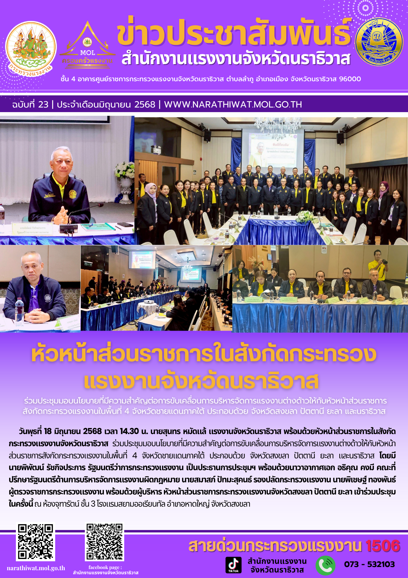วันพุธที่ 18 มิถุนายน 2568 เวลา 14.30 น. นายสุนทร หมัดแล้ แรงงานจังหวัดนราธิวาส พร้อมด้วยหัวหน้าส่วนราชการในสังกัดกระทรวงแรงงานจังหวัดนราธิวาส ร่วมประชุมมอบนโยบายที่มีความสำคัญต่อการขับเคลื่อนการบริหารจัดการแรงงานต่างด้าวให้กับหัวหน้าส่วนราชการสังกัดกระทรวงแรงงานในพื้นที่ 4 จังหวัดชายแดนภาคใต้ ประกอบด้วย จังหวัดสงขลา ปัตตานี ยะลา และนราธิวาส โดยมี นายพิพัฒน์ รัชกิจประการ รัฐมนตรีว่าการกระทรวงแรงงาน เป็นประธานการประชุมฯ พร้อมด้วยนาวาอากาศเอก อธิคุณ คงมี คณะที่ปรึกษารัฐมนตรีด้านการบริหารจัดการแรงงานผิดกฎหมาย นายสมาสภ์ ปัทมะสุคนธ์ รองปลัดกระทรวงแรงงาน นายพิเชษฐ์ ทองพันธ์ ผู้ตรวจราชการกระทรวงแรงงาน พร้อมด้วยผู้บริหาร หัวหน้าส่วนราชการกระทรวงแรงงานจังหวัดสงขลา ปัตตานี ยะลา เข้าร่วมประชุมในครั้งนี้ ณ ห้องจุฑารัตน์ ชั้น 3 โรงแรมสยามออเรียนทัล อำเภอหาดใหญ่ จังหวัดสงขลา
