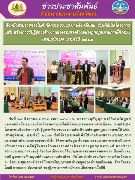 หัวหน้าส่วนราชการในสังกัดกระทรวงแรงงานจังหวัดเลย ร่วมพิธีเปิดโครงการเสริมสร้างการรับรู้สู่การจ้างงานแรงงานต่างด้าวอย่างถูกกฎหมายภายใต้ MOU (ส่วนภูมิภาค) ประจำปี 2562