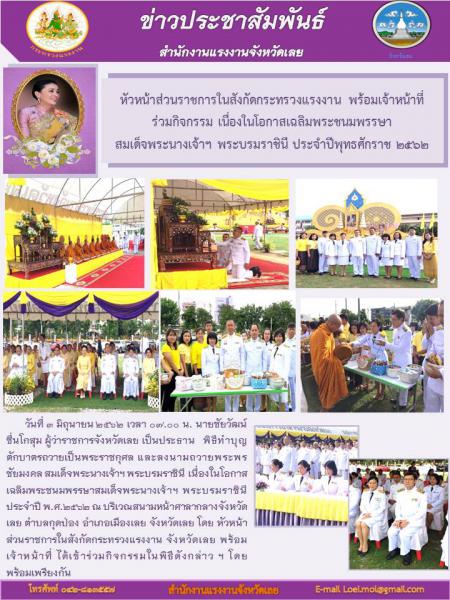 หัวหน้าส่วนราชการในสังกัดกระทรวงแรงงาน ร่วมกิจกรรมเนื่องในโอกาสเฉลิมพระชนมพรรษา สมเด็จพระนางเจ้าฯ พระบรมราชินี ประจำปีพุทธศักราช 2562