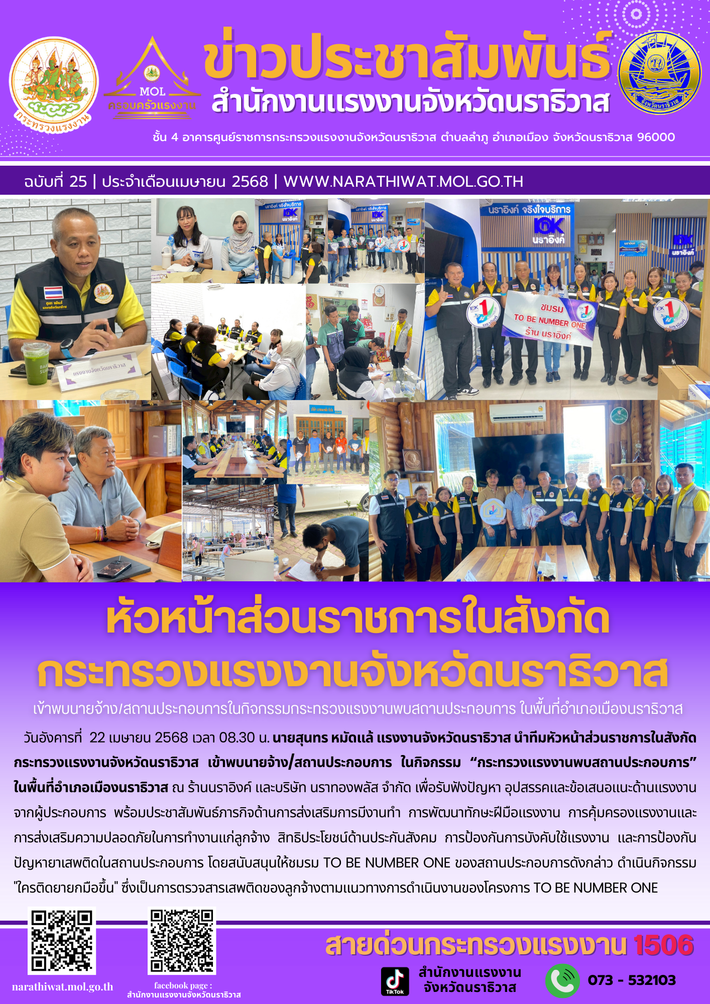วันอังคารที่ 22 เมษายน 2568 เวลา 08.30 น. นายสุนทร หมัดแล้ แรงงานจังหวัดนราธิวาส นำทีมหัวหน้าส่วนราชการในสังกัดกระทรวงแรงงานจังหวัดนราธิวาส เข้าพบนายจ้าง/สถานประกอบการ ในกิจกรรม “กระทรวงแรงงานพบสถานประกอบการ” ในพื้นที่อำเภอเมืองนราธิวาส ณ ร้านนราอิงค์ และบริษัท นราทองพลัส จำกัด เพื่อรับฟังปัญหา อุปสรรคและข้อเสนอแนะด้านแรงงานจากผู้ประกอบการ พร้อมประชาสัมพันธ์ภารกิจด้านการส่งเสริมการมีงานทำ การพัฒนาทักษะฝีมือแรงงาน การคุ้มครองแรงงานและการส่งเสริมความปลอดภัยในการทำงานแก่ลูกจ้าง สิทธิประโยชน์ด้านประกันสังคม การป้องกันการบังคับใช้แรงงาน และการป้องกันปัญหายาเสพติดในสถานประกอบการ โดยสนับสนุนให้ชมรม TO BE NUMBER ONE ของสถานประกอบการดังกล่าว ดำเนินกิจกรรม “ใครติดยายกมือขึ้น” ซึ่งเป็นการตรวจสารเสพติดของลูกจ้างตามแนวทางการดำเนินงานของโครงการ TO BE NUMBER ONE